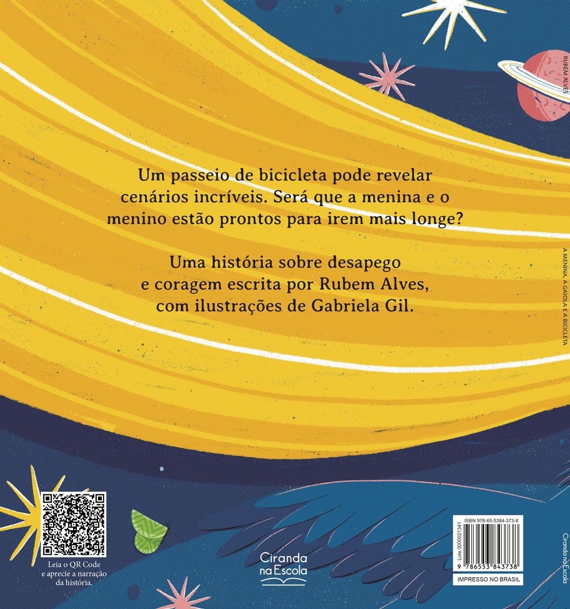 Um passeio de bicicleta pode revelar cenários incríveis. Será que a menina e o menino estão prontos para irem mais longe? Uma história sobre desapego e coragem escrita por Rubem Alves, com ilustrações de Gabriela Gil.