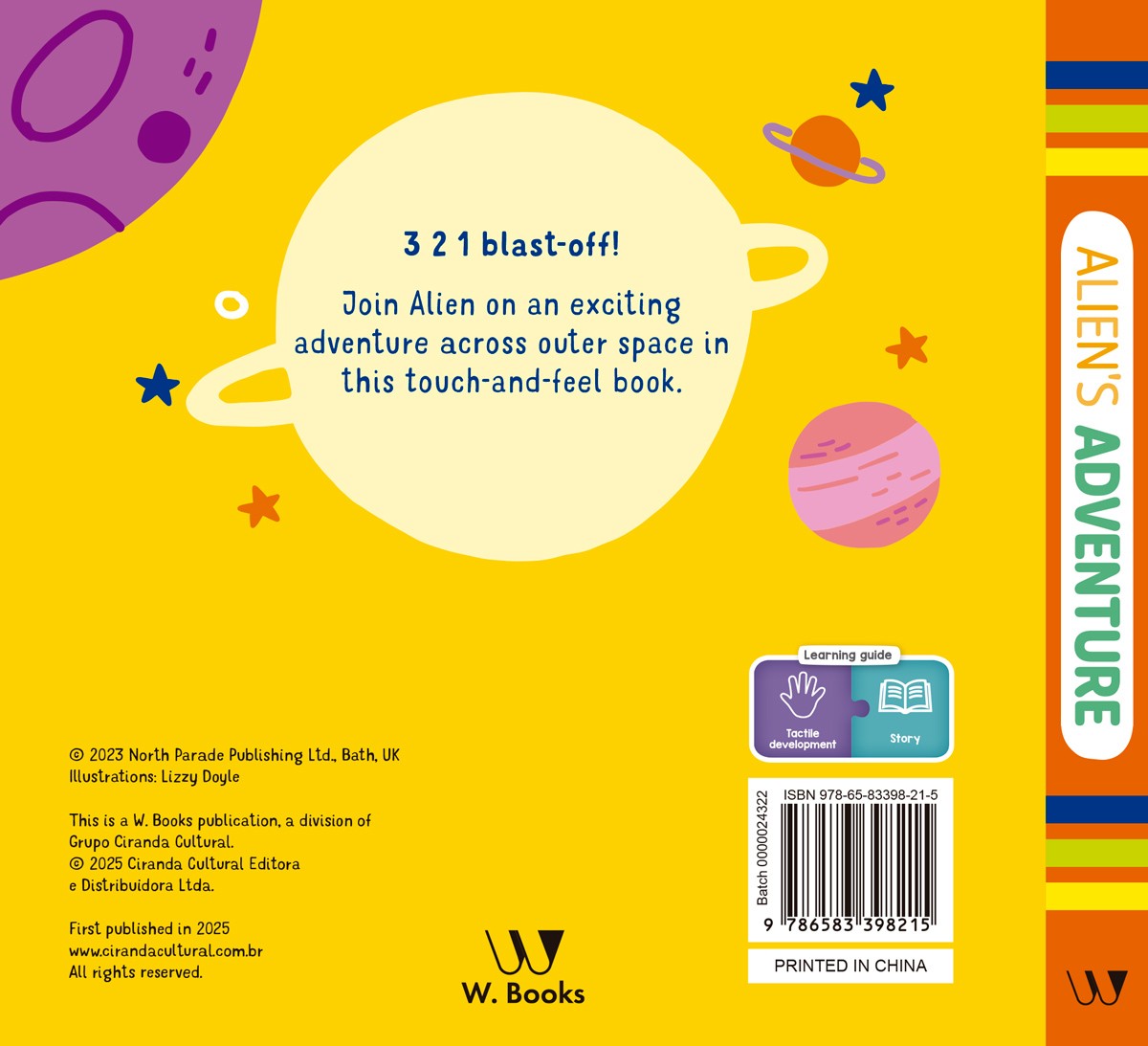 3 2 1 blast-off! Join Alien on an exciting adventure across outer space in this touch-and-feel book