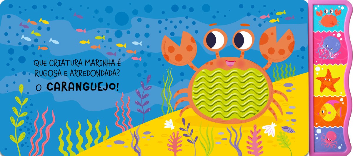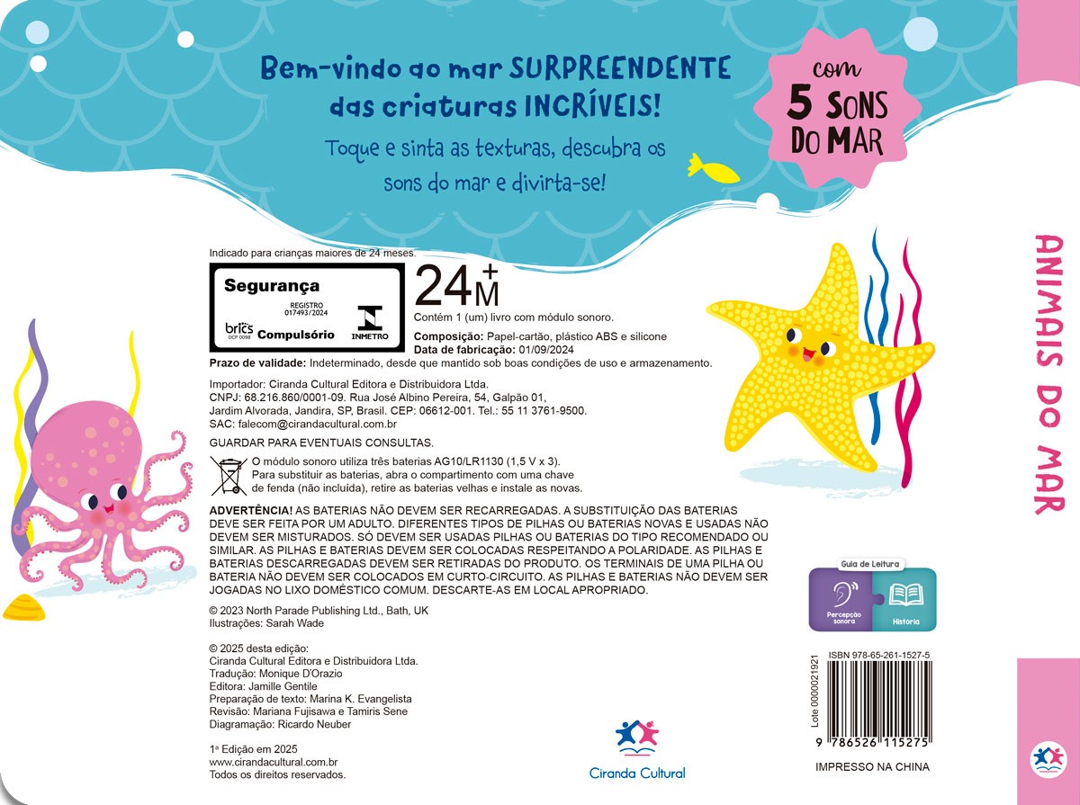Bem-vindo ao mar surpreendente das criaturas incríveis! Toque e sinta as texturas, descubra os sons do mar e divirta-se! Com 5 sons incríveis, conte a história e a cada página mostre o som para seu pequeno ou deixe ele descobrir, sentir tornando o momento ainda mais divertido e interativo. E não se preocupe: se a bateria acabar, é só trocar e a diversão continua sem parar!