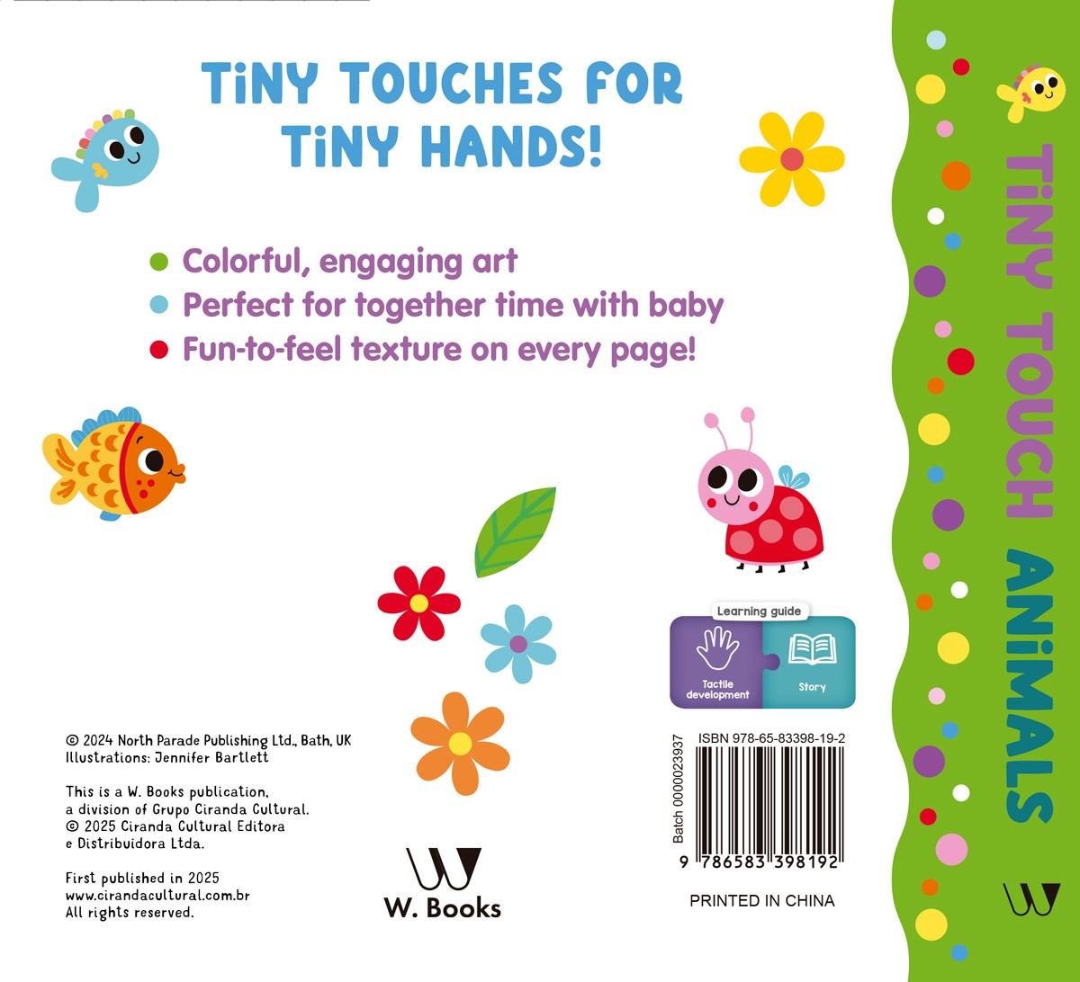 Tiny touches for tiny hands! Colorful, engaging art. Perfect for together time with baby. Fun-to-feel texture on every page!