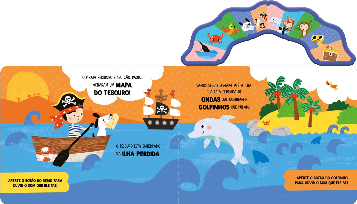 Explore os sons no caminho a uma caça ao tesouro divertida e conheça uma ilha perdida neste colorido livro sonoro!