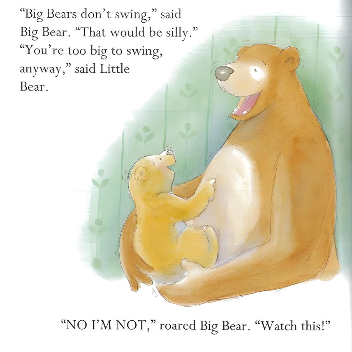 Can Big Bears do everything? Big Bear certainly believes they can but Little Bear isnt so sure. So, when Mummy Bear goes out, Big Bear has a chance to prove that he can do anything Little Bear can do. Things begin to go wrong, though, when Big Bear starts swinging on the curtains and bouncing on the chairs. What will Mummy Bear say when she sees the mess? Can Big Bears get in trouble?