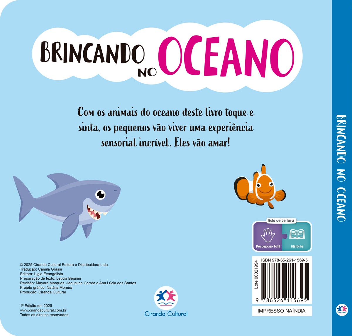 Mergulhe nas águas do oceano com o livro sensorial Brincando no Oceano! Cada animal marinho tem sua barriguinha representada com uma textura única, como a pele escorregadia do golfinho ou a suavidade da barriga do peixe. Ao tocar as barriguinhas, as crianças são transportadas para o fundo do mar, aprendendo sobre a vida aquática de maneira interativa e sensorial. Uma experiência de aprendizado divertida que vai encantar os pequenos exploradores do mundo subaquático!