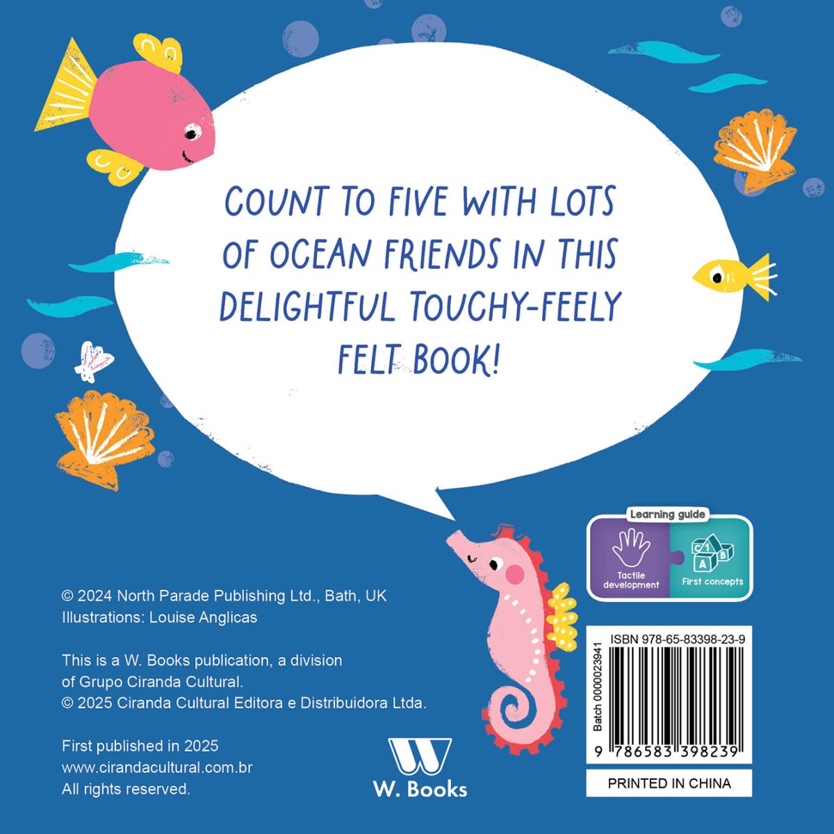 Count to five with lots of ocean friends in this delightful touchy-feely felt book!