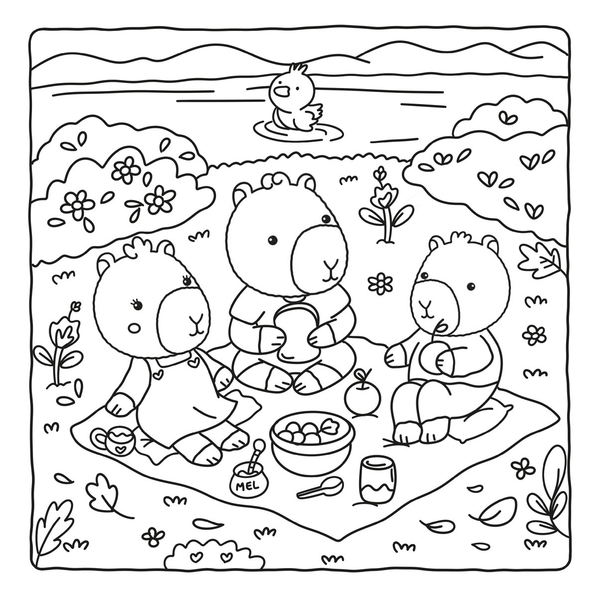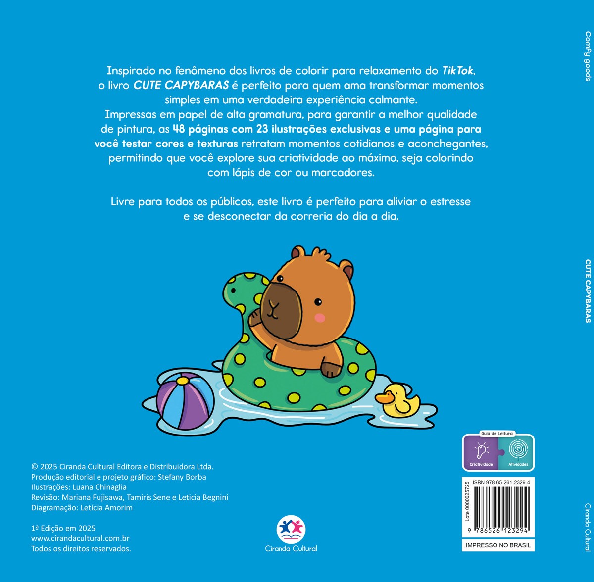 Inspirado no fenômeno dos livros de colorir para relaxamento do TikTok,o livro CUTE CAPYBARAS é perfeito para quem ama transformar momentos simples em uma verdadeira experiência calmante. Impressas em papel de alta gramatura, para garantir a melhor qualidade de pintura, as 48 páginas com 23 ilustrações exclusivas e uma página para você testar cores e texturas retratam momentos cotidianos e aconchegantes, permitindo que você explore sua criatividade ao máximo, seja colorindo com lápis de cor ou marcadores. Livre para todos os públicos, este livro é perfeito para aliviar o estresse e se desconectar da correria do dia a dia.
