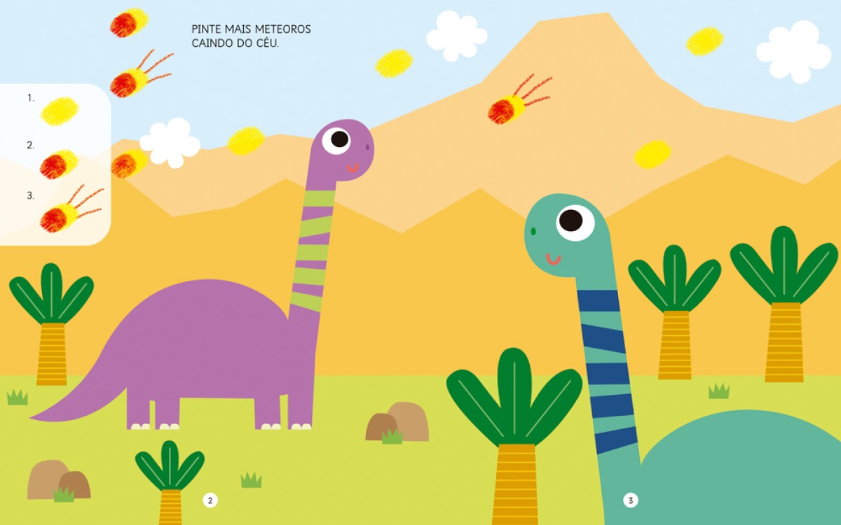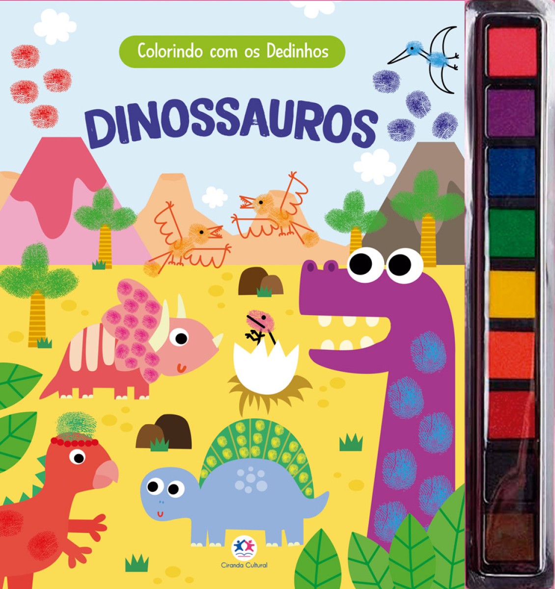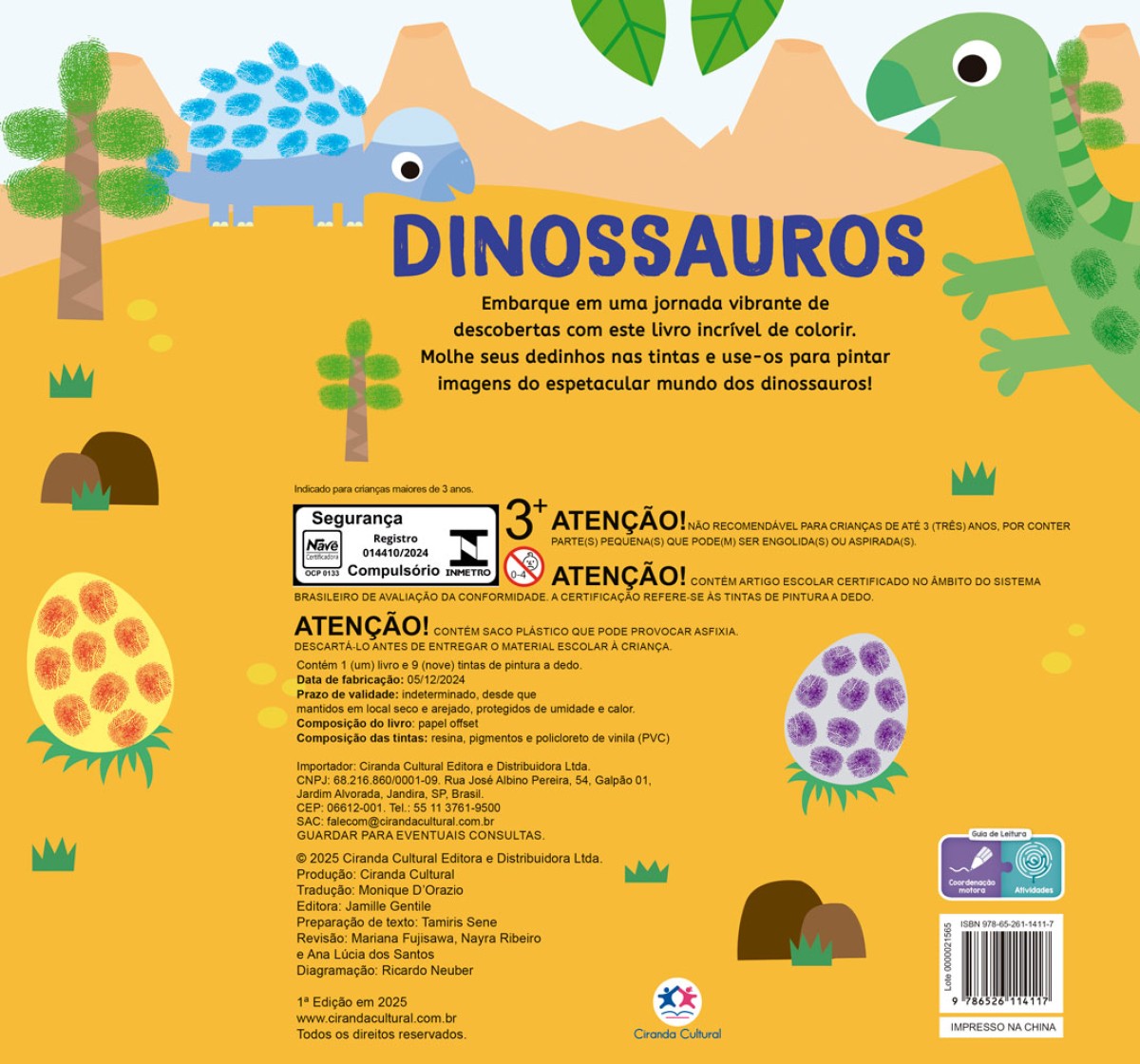 Embarque em uma jornada vibrante de descoberta com este livro incrível de colorir. Molhe seus dedinhos nas tintas e use-os para pintar desenhos de lindos dinossauros!