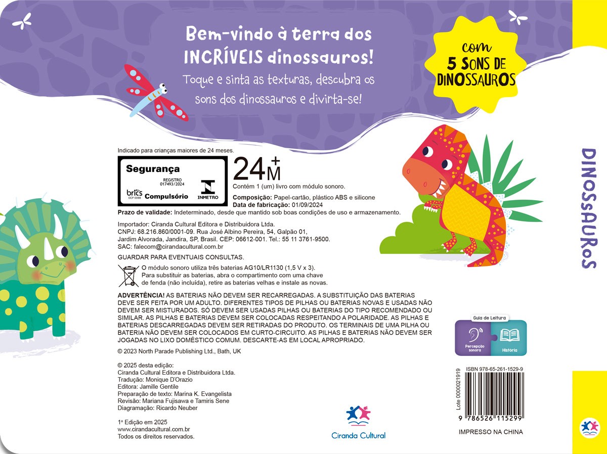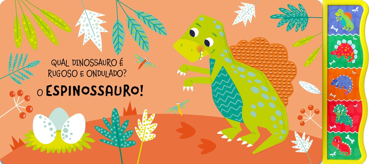 Bem-vindo à terra dos incríveis dinossauros! Toque e sinta as texturas, descubra os sons dos dinossauros e divirta-se! Com 5 sons incríveis, conte a história e a cada página mostre o som para seu pequeno ou deixe ele descobrir, sentir tornando o momento ainda mais divertido e interativo. E não se preocupe: se a bateria acabar, é só trocar e a diversão continua sem parar!