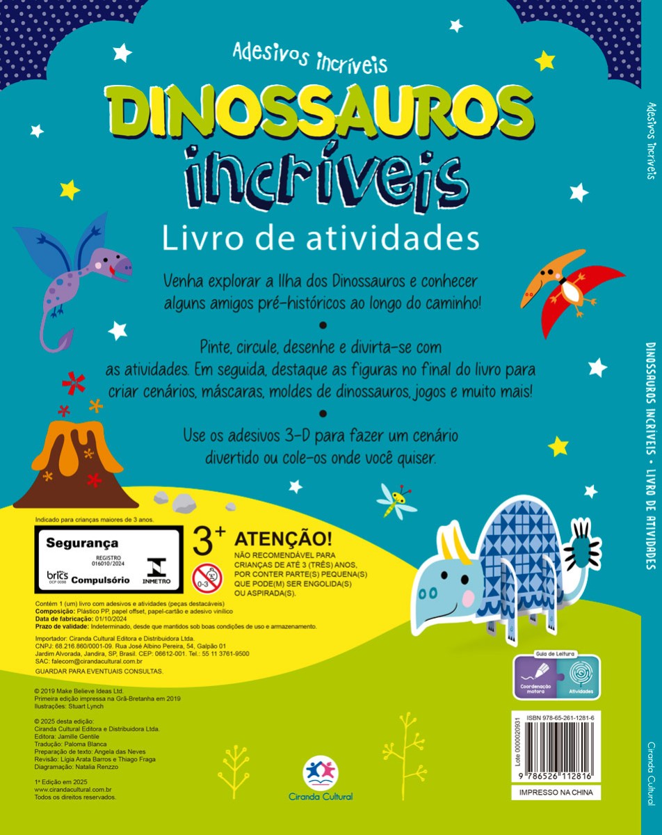 Venha explorar a Ilha dos Dinossauros e conhecer alguns amigos pré-históricos ao longo do caminho! Pinte, circule, desenhe e divirta-se com as atividades. Em seguida, destaque as figuras no final do livro para criar cenários, máscaras, moldes de dinossauros, jogos e muito mais! Use os adesivos 3-D para fazer um cenário divertido ou cole-os onde você quiser.