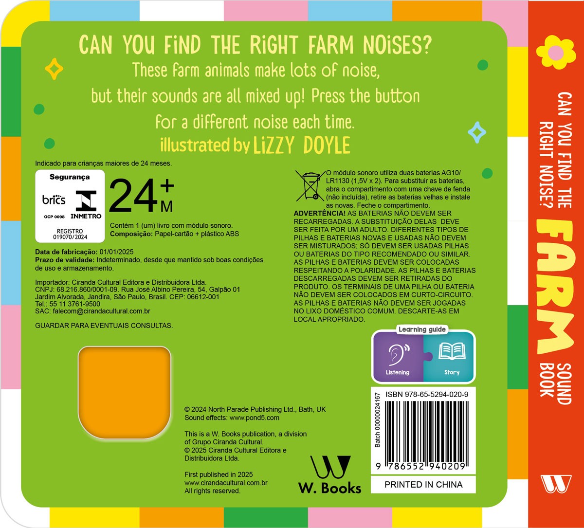 Can you find the right farm noises? These farm animals make lots of noise, but their sounds are all mixed up! Press the button for a different noise each time. And don't worry: if the battery runs out, just replace it and the fun continues!
