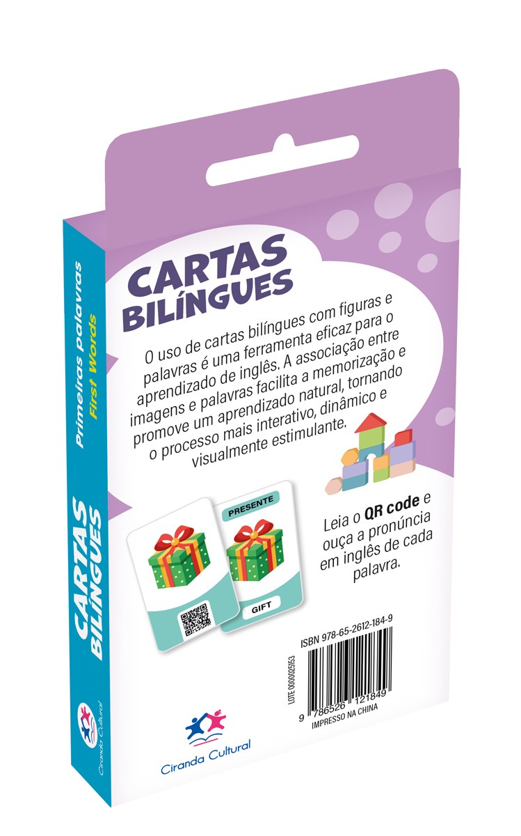 O uso de cartas bilíngues com figuras e palavras é uma ferramenta eficaz para o aprendizado de inglês. A associação entre imagens e palavras facilita a memorização e promove um aprendizado natural, tornando o processo mais interativo, dinâmico e visualmente estimulante.