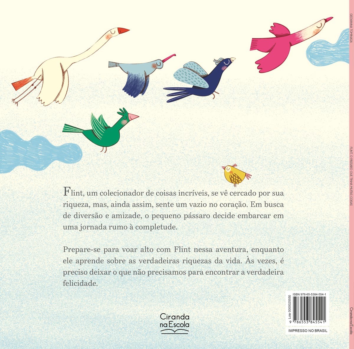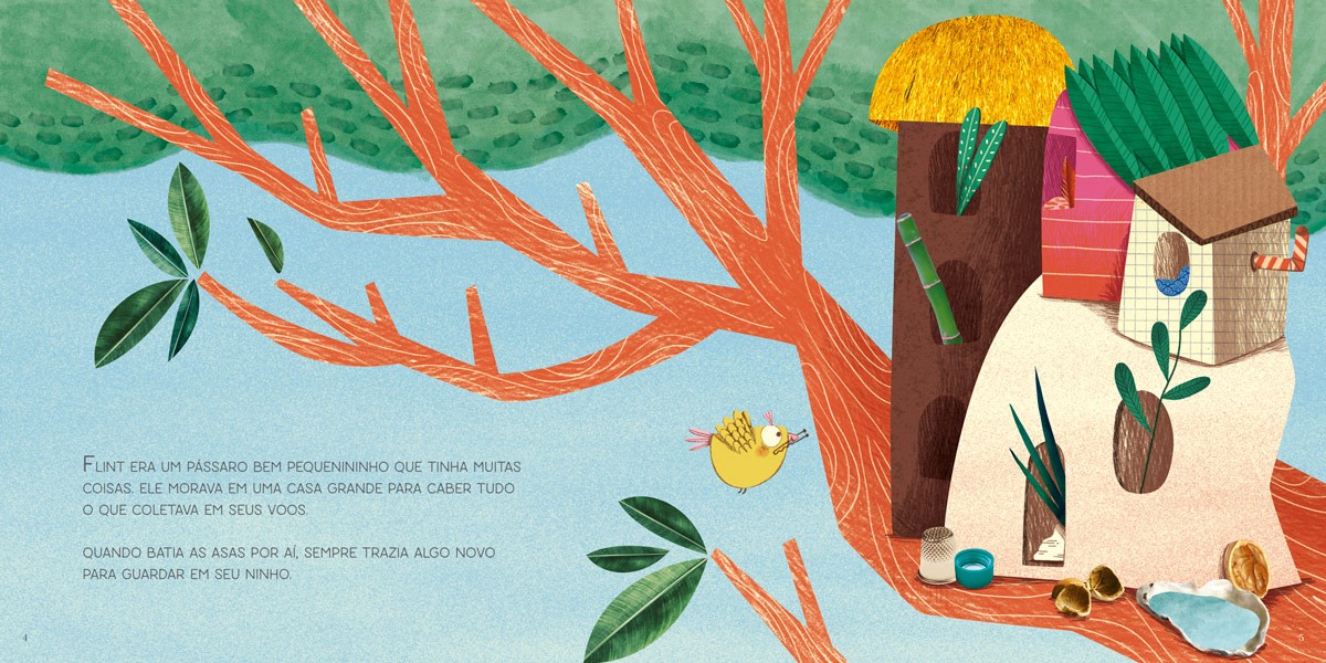 Flint, um colecionador de coisas incríveis, se vê cercado por sua riqueza, mas, ainda assim, sente um vazio no coração. Em busca de diversão e amizade, o pequeno pássaro decide embarcar em uma jornada rumo à completude. Prepare-se para voar alto com Flint nessa aventura, enquanto ele aprende sobre as verdadeiras riquezas da vida. Às vezes, é preciso deixar o que não precisamos para encontrar a verdadeira felicidade.