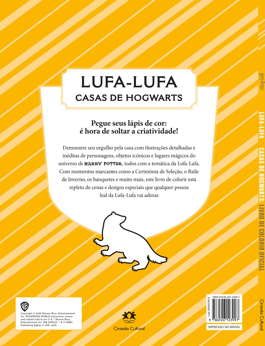 Entre no universo acolhedor e leal da Casa Lufa-Lufa com este livro de colorir oficial do universo dos filmes de Harry Potter, parte da coleção especial Casas de Hogwarts. Com ilustrações detalhadas e exclusivas, descubra os valores e símbolos que tornam essa casa tão única: o texugo, as cores amarelo e preto, a sabedoria de Helga Hufflepuff e o espírito de união que marca seus alunos.