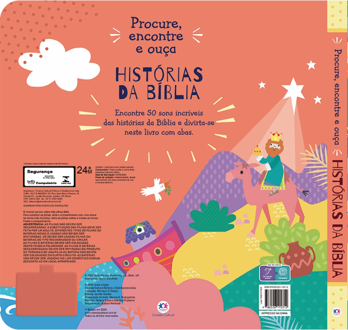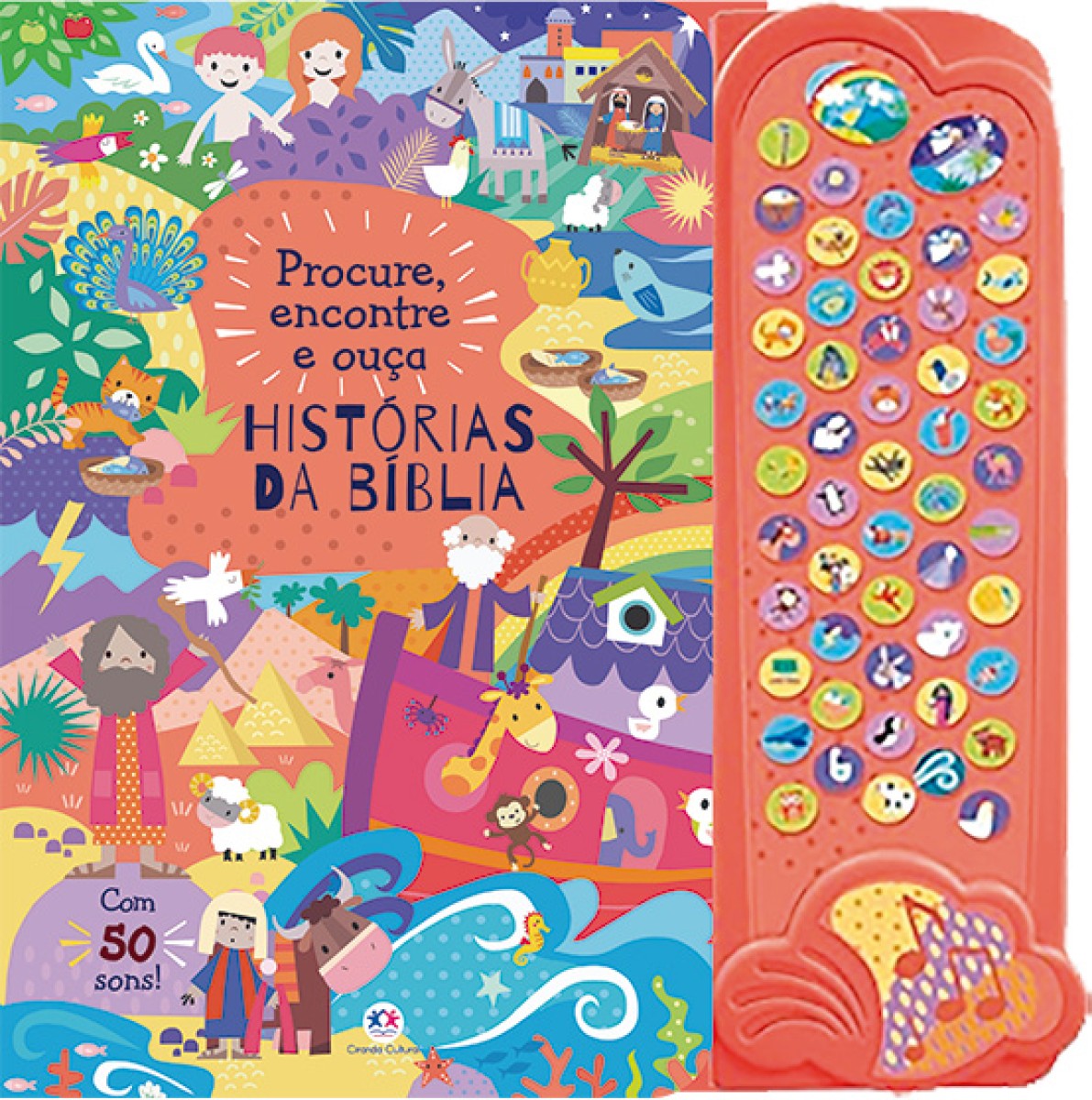 Procure e encontre muitas imagens de histórias da Bíblia e ouça mais de 50 sons neste livro divertido. E não se preocupe: se a bateria acabar, é só trocar e a diversão continua sem parar!