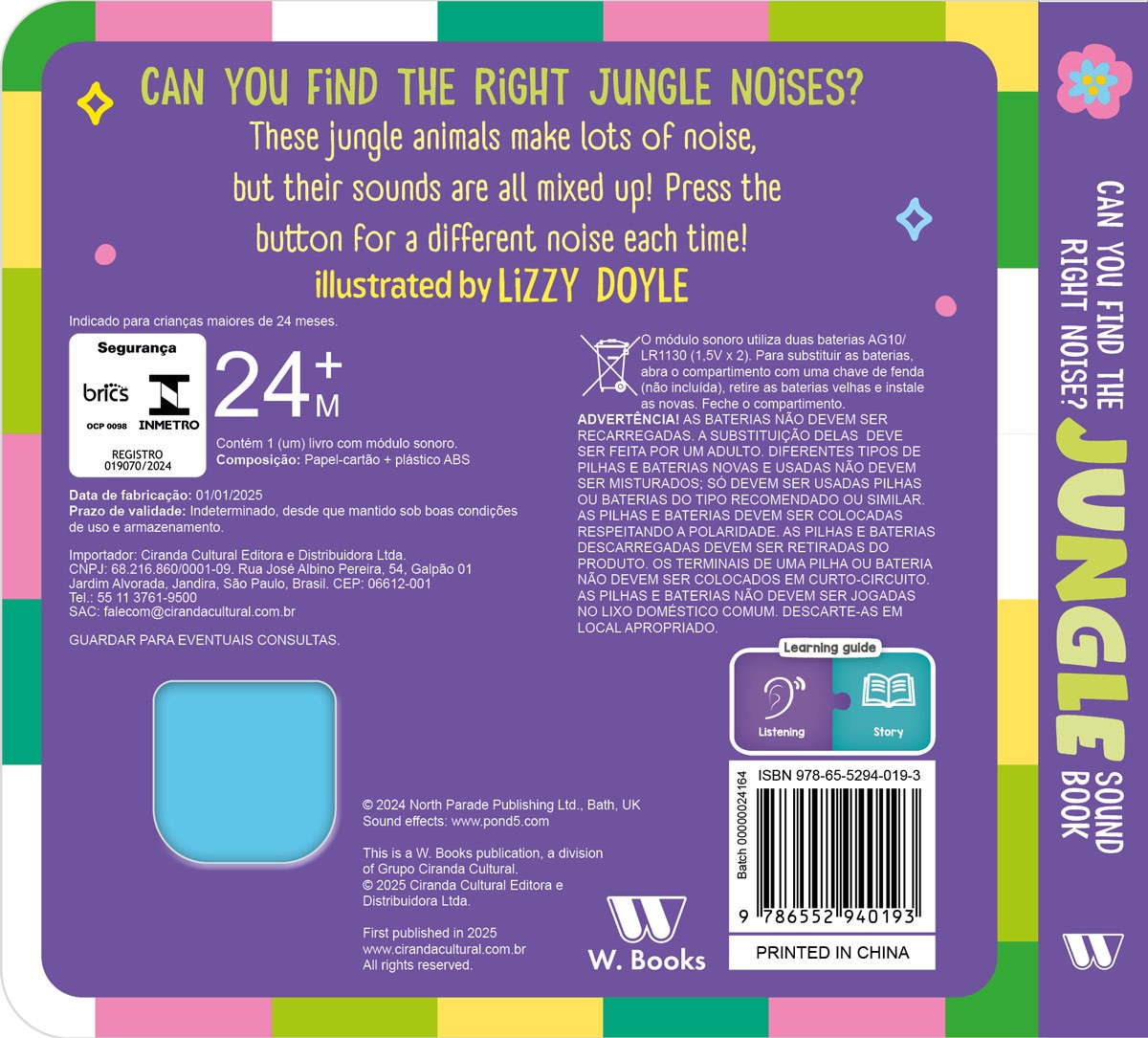 Can you find the right Jungle noises? These jungle animals make lots of noise, but their sounds are all mixed up! Press the button for a different noise each time! And don't worry: if the battery runs out, just replace it and the fun continues! And don't worry: if the battery runs out, just replace it and the fun continues!