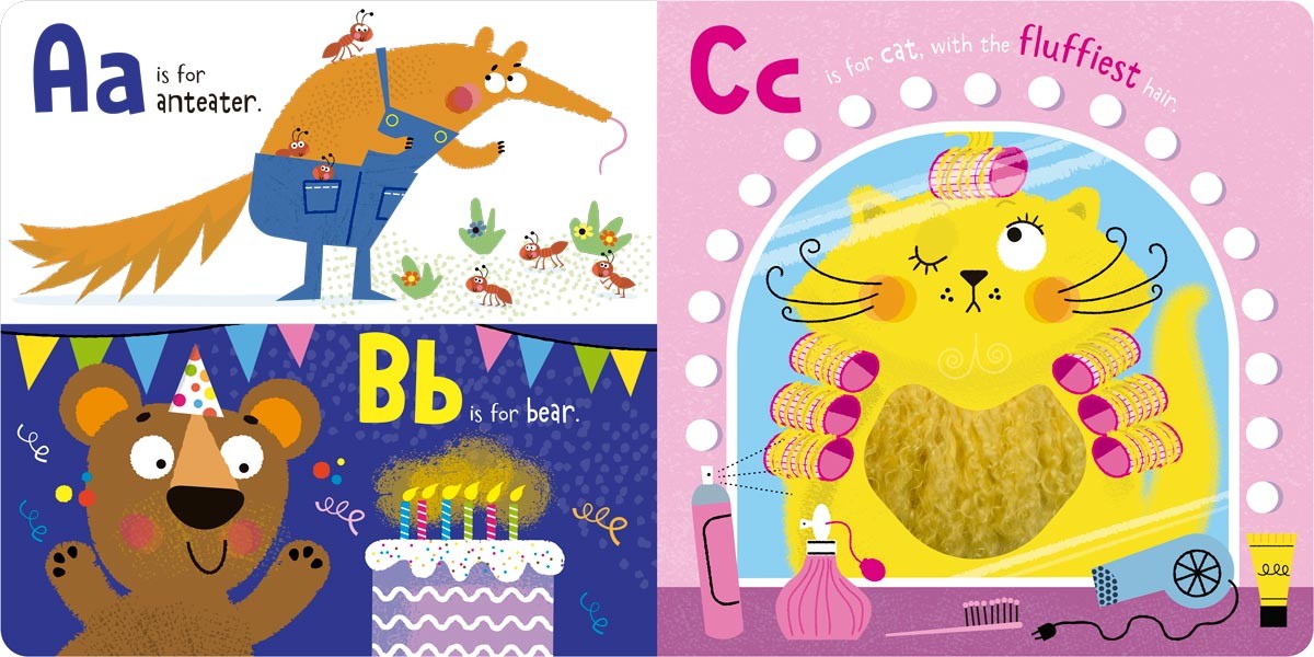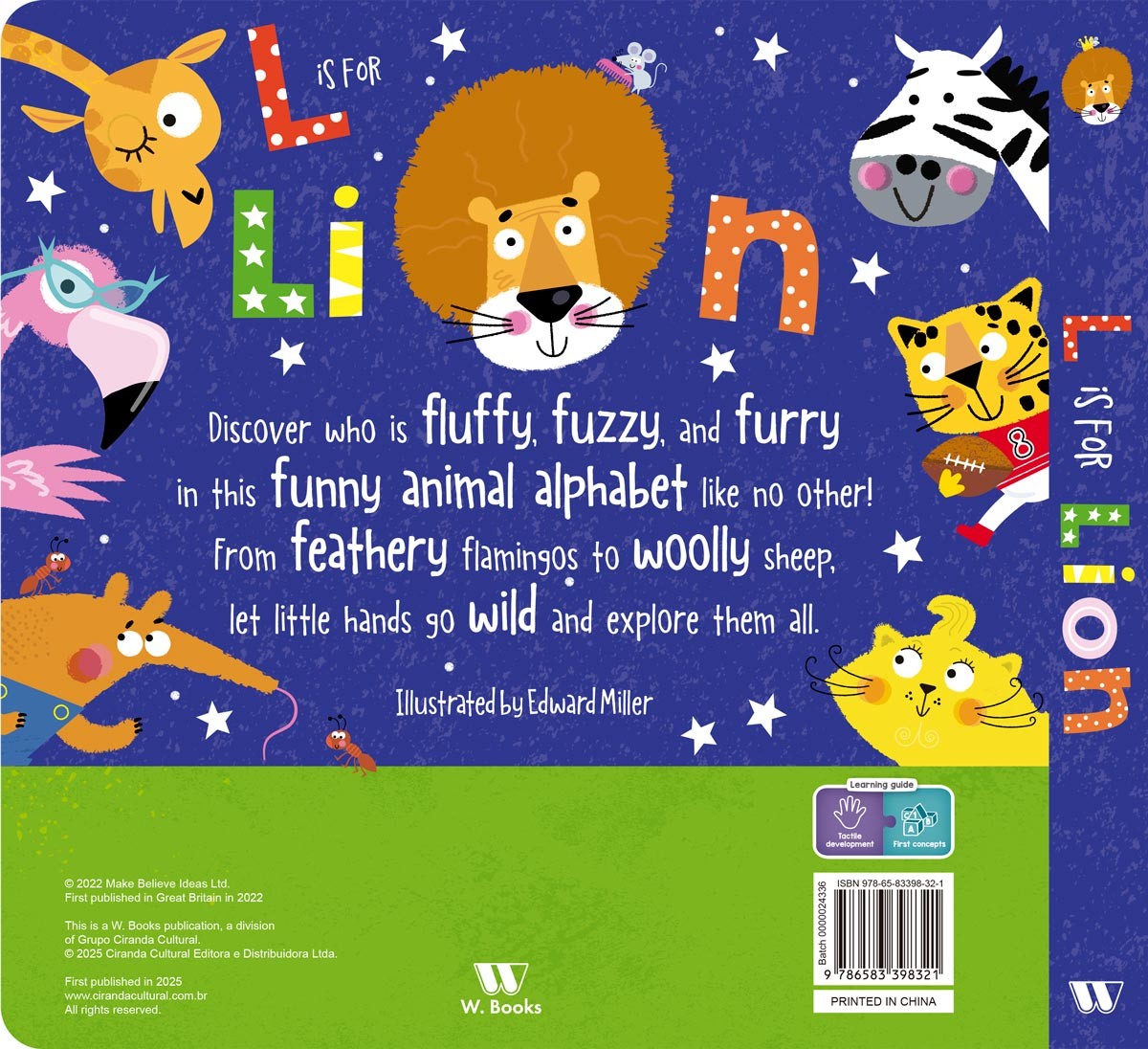 Discover who is fluffy, fuzzy, and furry in this funny animal alphabet like no other! From feathery flamingos to woolly sheep, let little hands go wild and explore them all.