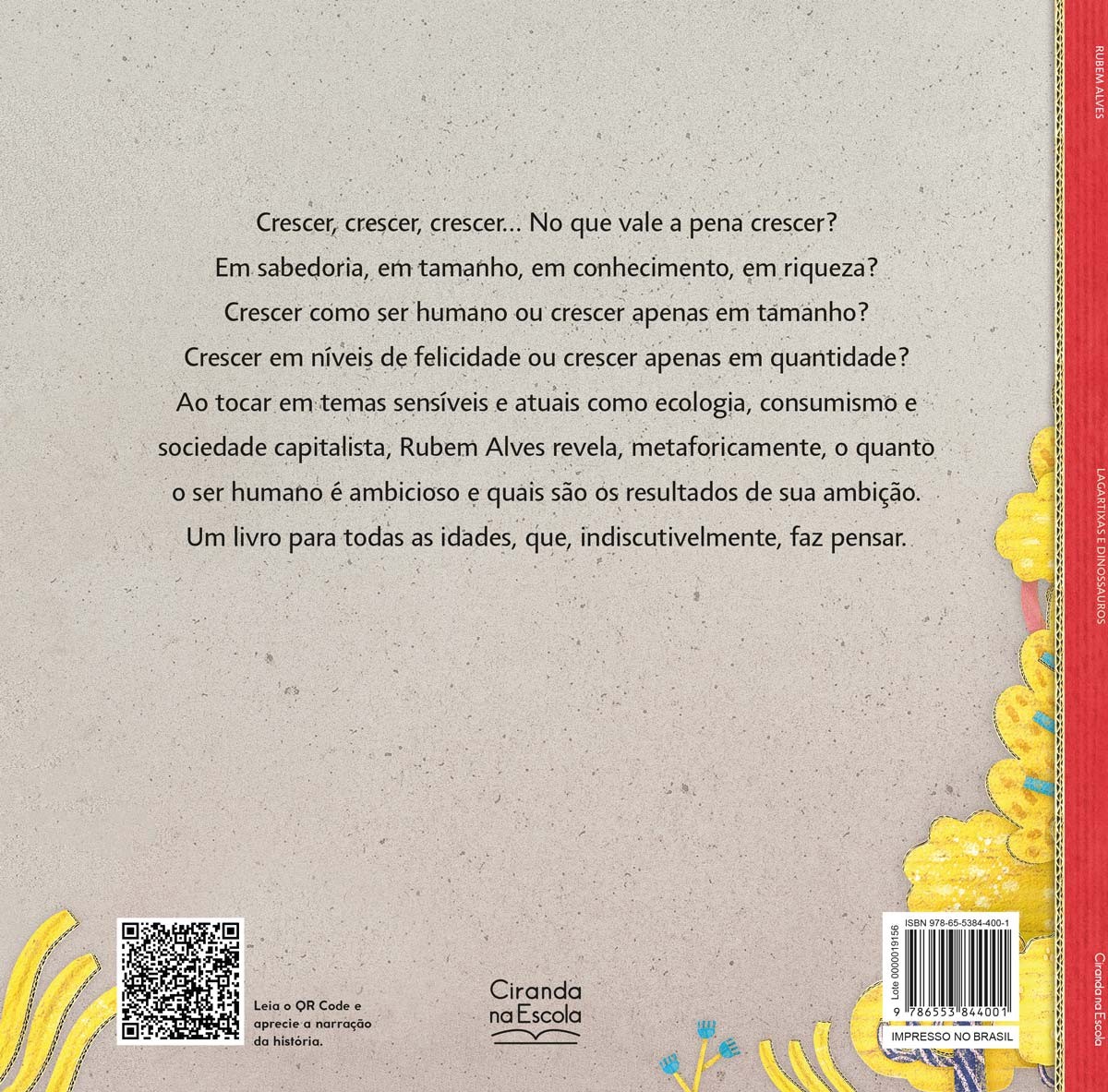 Crescer, crescer, crescer... No que vale a pena crescer? Em sabedoria, em tamanho, em conhecimento, em riqueza? Crescer como ser humano ou crescer apenas em tamanho? Crescer em níveis de felicidade ou crescer apenas em quantidade? Ao tocar em temas sensíveis e atuais como ecologia, consumismo e sociedade capitalista, Rubem Alves revela, metaforicamente, o quanto o ser humano é ambicioso e qual os resultados de sua ambição. Um livro para todas as idades, que, indiscutivelmente, faz pensar.