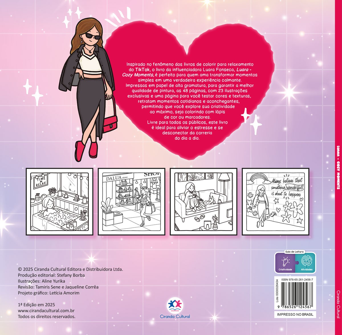 Inspirado no fenômeno dos livros de colorir para relaxamento do TikTok, o livro da influenciadora Luara Fonseca, Luara - Cozy Moments, é perfeito para quem ama transformar momentos simples em uma verdadeira experiência calmante. Impressas em papel de alta gramatura, para garantir a melhor qualidade de pintura, as 48 páginas, com 23 ilustrações exclusivas e uma página para você testar cores e texturas, retratam momentos cotidianos e aconchegantes, permitindo que você explore sua criatividade ao máximo, seja colorindo com lápis de cor ou marcadores. Livre para todos os públicos, este livro é ideal para aliviar o estresse e se