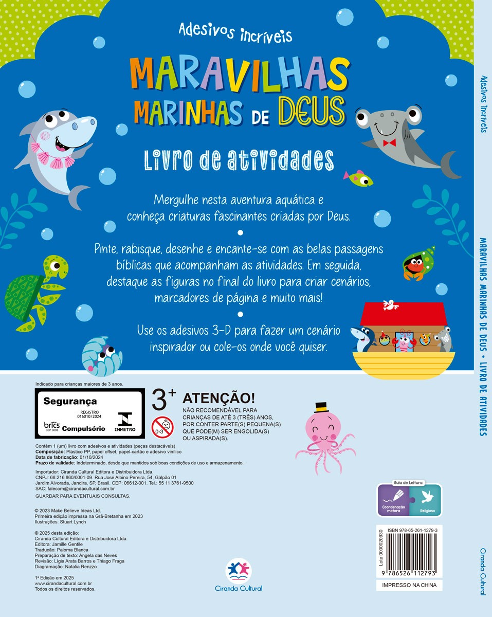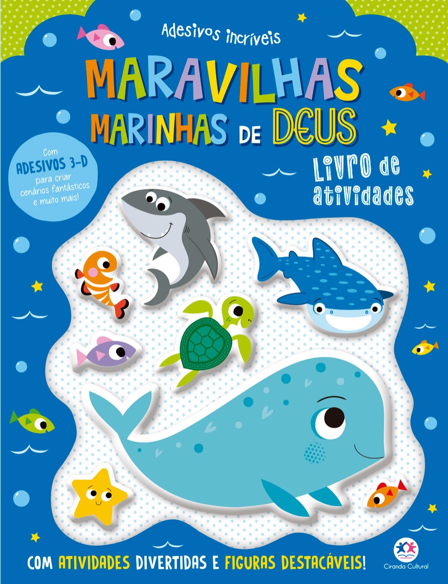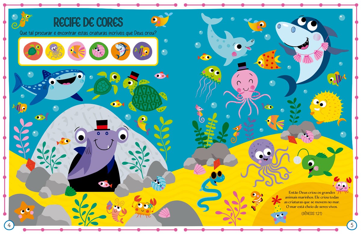 Mergulhe nesta aventura aquática e conheça criaturas fascinantes criadas por Deus. Pinte, rabisque, desenhe e encante-se com as belas passagens bíblicas que acompanham as atividades. Em seguida, destaque as figuras no final do livro para criar cenários