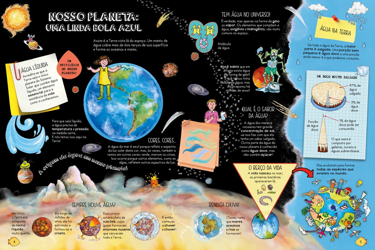 Visto lá do alto, o nosso planeta é uma linda bola azul, pois a água cobre mais da metade da superfície, dando formas aos oceanos e mares. Você gostaria de saber se sempre houve água na Terra ou como era a navegação em outros tempos? Consegue imaginar como é um oceano por dentro ou o que vive em suas profundezas? Quer descobrir como podemos cuidar melhor dos nossos mares? Neste livro, você encontrará a resposta para essas e muitas outras perguntas. Está preparado para explorar estas páginas?