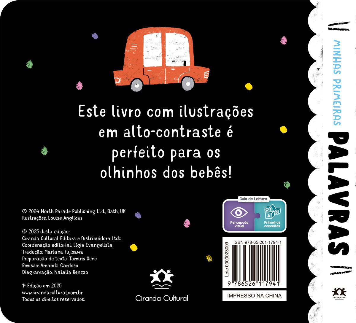 Aprenda palavras básicas com imagens em alto contraste que ajudam a fixar o vocabulário de forma visual e atraente. Com 10 páginas ilustradas, este livro apoia o desenvolvimento da linguagem e a percepção visual.