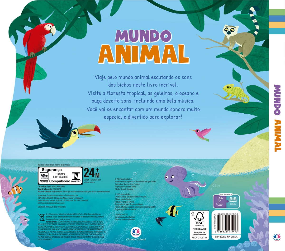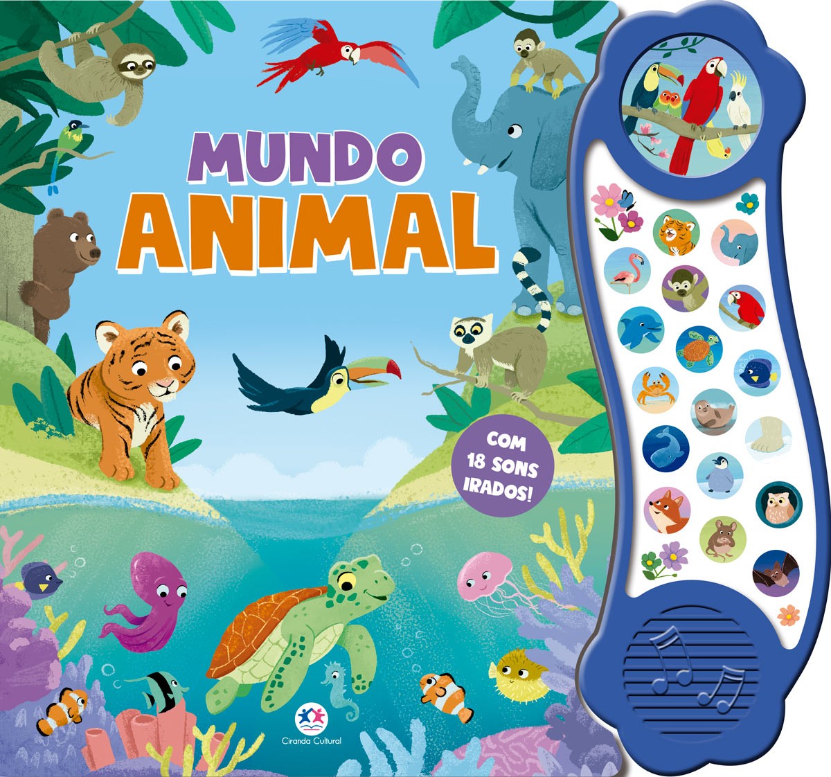 Viaje pelo mundo animal escutando os sons dos bichos neste livro incrível. Visite a floresta tropical, as geleiras, o oceano e ouça dezoito sons, incluindo bela música. Você vai se encontrar com um mundo sonoro muito especial e divertido para explorar! E não se preocupe: se a bateria acabar, é só trocar e a diversão continua sem parar!