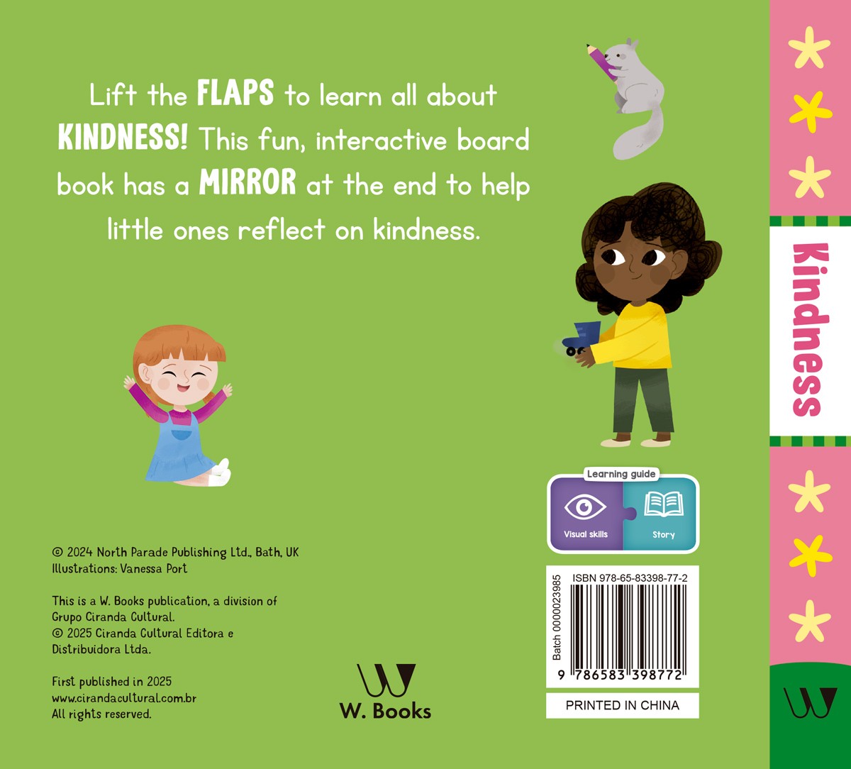 In this fun and interactive book, children will lift their eyes, discover kind attitudes, and learn, in a light and playful way, how to do good in their daily lives. And there's a special detail: a mirror at the end invites little ones to see themselves as true agents of kindness! A delightful read that encourages empathy, caring for others, and self-awareness.