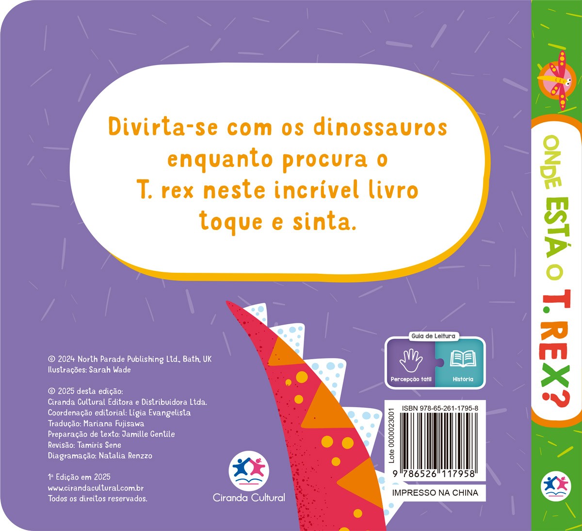 Prepare-se para explorar o mundo dos dinossauros de uma forma divertida e interativa! Neste livro "toque e sinta", as crianças vão conhecer diferentes dinossauros enquanto procuram o temido T. rex. Com texturas em cada página, os pequenos leitores poderão sentir a pele escamosa, os espinhos e outras surpresas pré-históricas. Uma leitura envolvente que estimula o tato, a curiosidade e a imaginação!