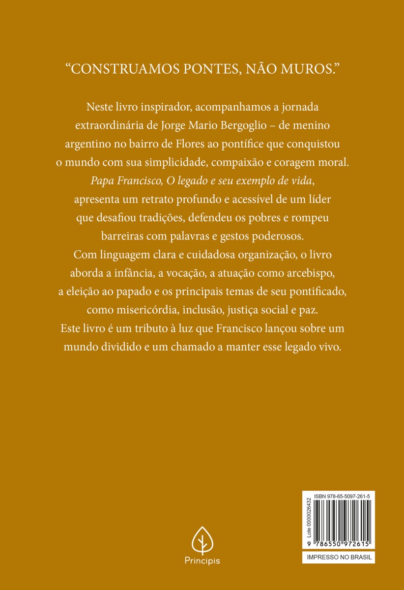 “CONSTRUAMOS PONTES, NÃO MUROS.” Neste livro inspirador, acompanhamos a jornada extraordinária de Jorge Mario Bergoglio – de menino argentino no bairro de Flores ao pontífice que conquistou o mundo com sua simplicidade, compaixão e coragem moral. Papa Francisco, O legado e seu exemplo de vida, apresenta um retrato profundo e acessível de um líder que desafiou tradições, defendeu os pobres e rompeu barreiras com palavras e gestos poderosos. Com linguagem clara e cuidadosa organização, o livro aborda a infância, a vocação, a atuação como arcebispo, a eleição ao papado e os principais temas de seu pontificado, como misericórdia, inclusão, justiça social e paz.