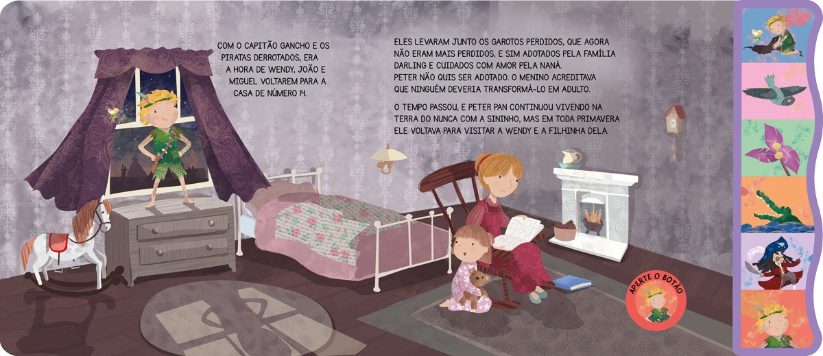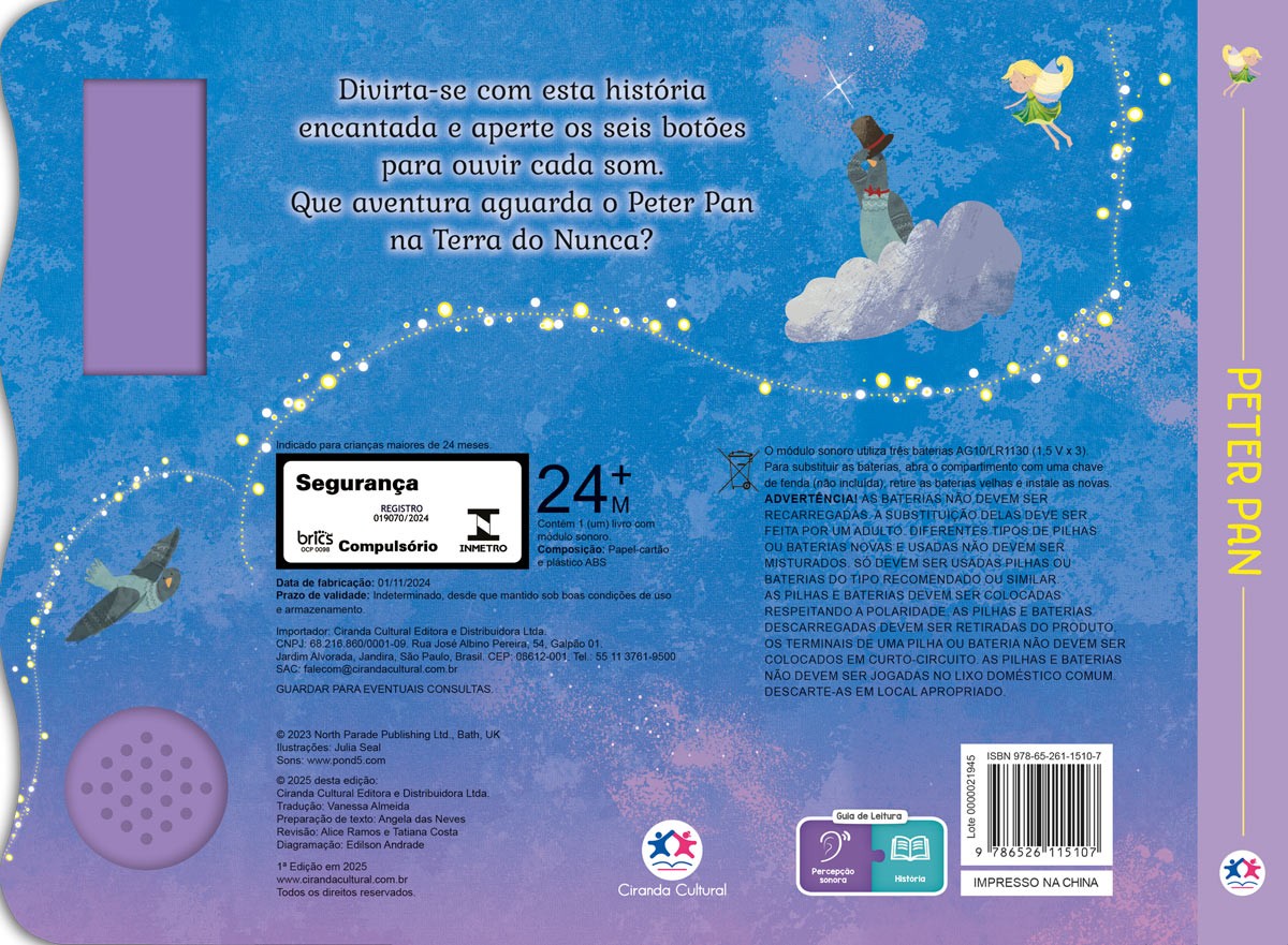 Divirta-se com esta história encantada e aperte os seis botões para ouvir cada som. Que aventura aguarda o Peter Pan na Terra do Nunca? E não se preocupe: se a bateria acabar, é só trocar e a diversão continua sem parar!