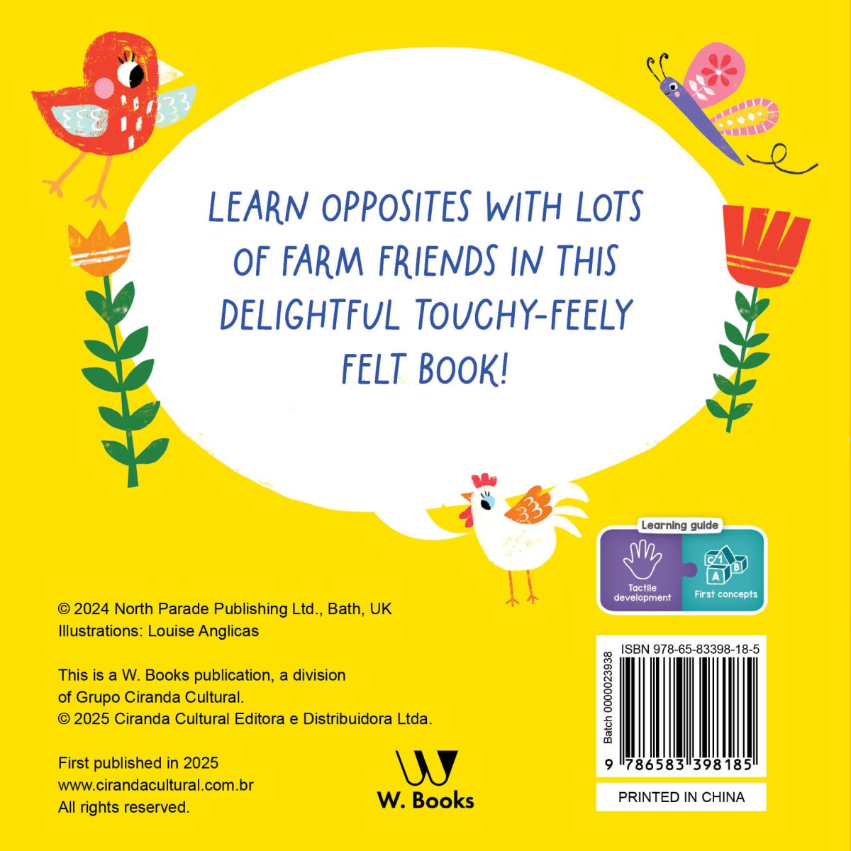 Learn opposites with lots of farm friends in this delightful touchy-feely felt book!