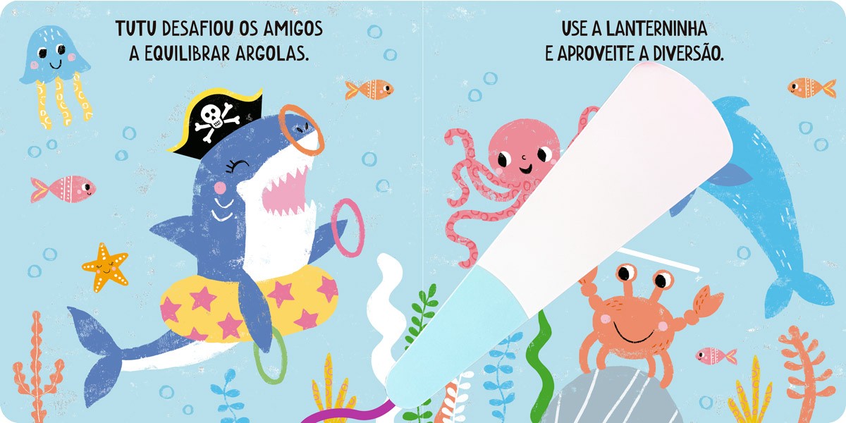 O tubarão está passeando e encontra muitos amigos. Que tal usar a lanterninha e se divertir com quem ele encontra nessa jornada aquática?