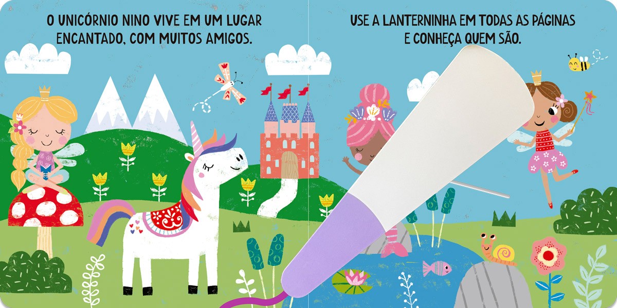 O unicórnio está passeando pela terra mágica e encontra muitos amigos. Que tal usar a lanterninha e se divertir com quem ele encontra pelo caminho?