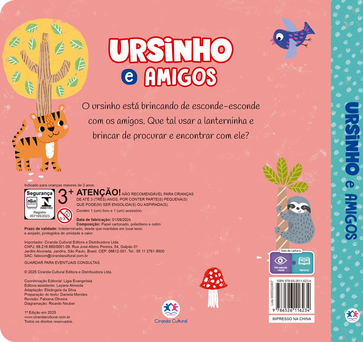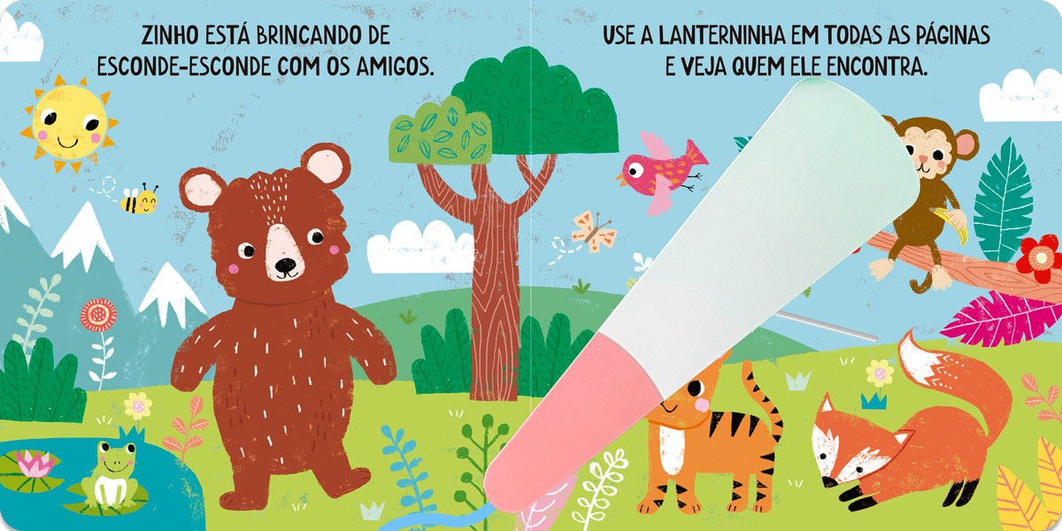 O ursinho está brincando de esconde-esconde com os amigos. Que tal usar a lanterninha e brincar de procurar e encontrar com ele?