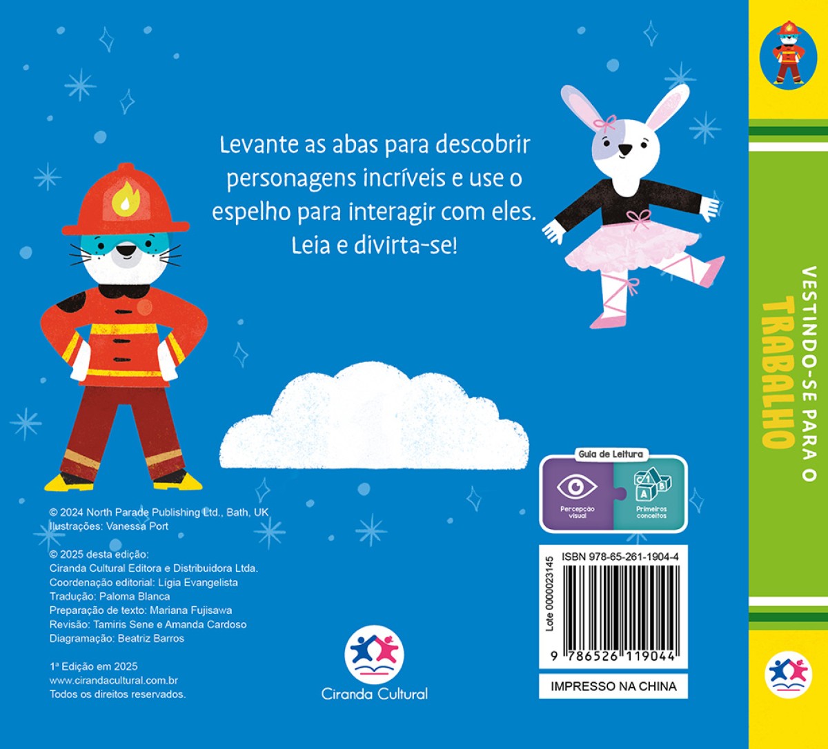 Neste livro interativo, as crianças vão se divertir levantando as abas para descobrir quais roupas combinam com cada personagem e seu trabalho. Bombeiro, médico, chef de cozinha... tem muitas profissões para explorar! E no final, um espelho especial permite que os pequenos se vejam e entrem na brincadeira também. Um livro que estimula a criatividade, o faz de conta e o aprendizado de forma lúdica e envolvente!