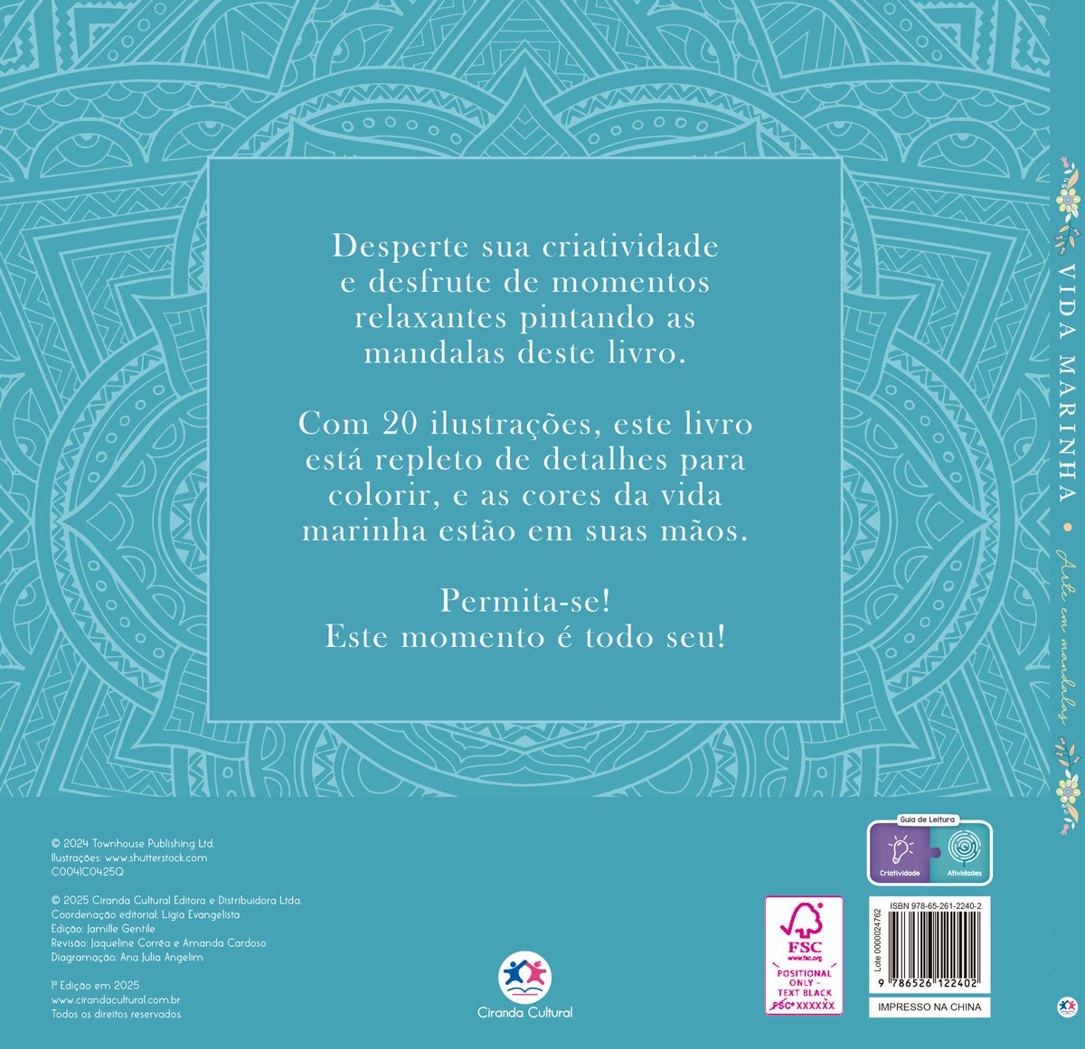 Desperte sua criatividade e desfrute de momentos relaxantes pintando as mandalas deste livro. Com 20 ilustrações, este livro está repleto de detalhes para colorir, e as cores da vida marinha estão em suas mãos. Permita-se! Este momento é todo seu!