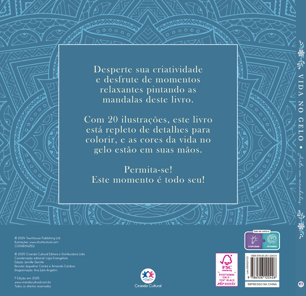 Entre no mágico e frio mundo das geleiras com Vida no Gelo, da Editora Ciranda Cultural. Com 20 mandalas encantadoras, inspiradas nas maravilhas do gelo e da neve, este livro proporciona uma experiência única de relaxamento e criatividade. Cada página convida você a se perder em detalhes que remetem a paisagens geladas e criaturas do inverno. Vida no Gelo é a oportunidade perfeita para pintar e sonhar enquanto relaxa em um cenário congelante e tranquilo.