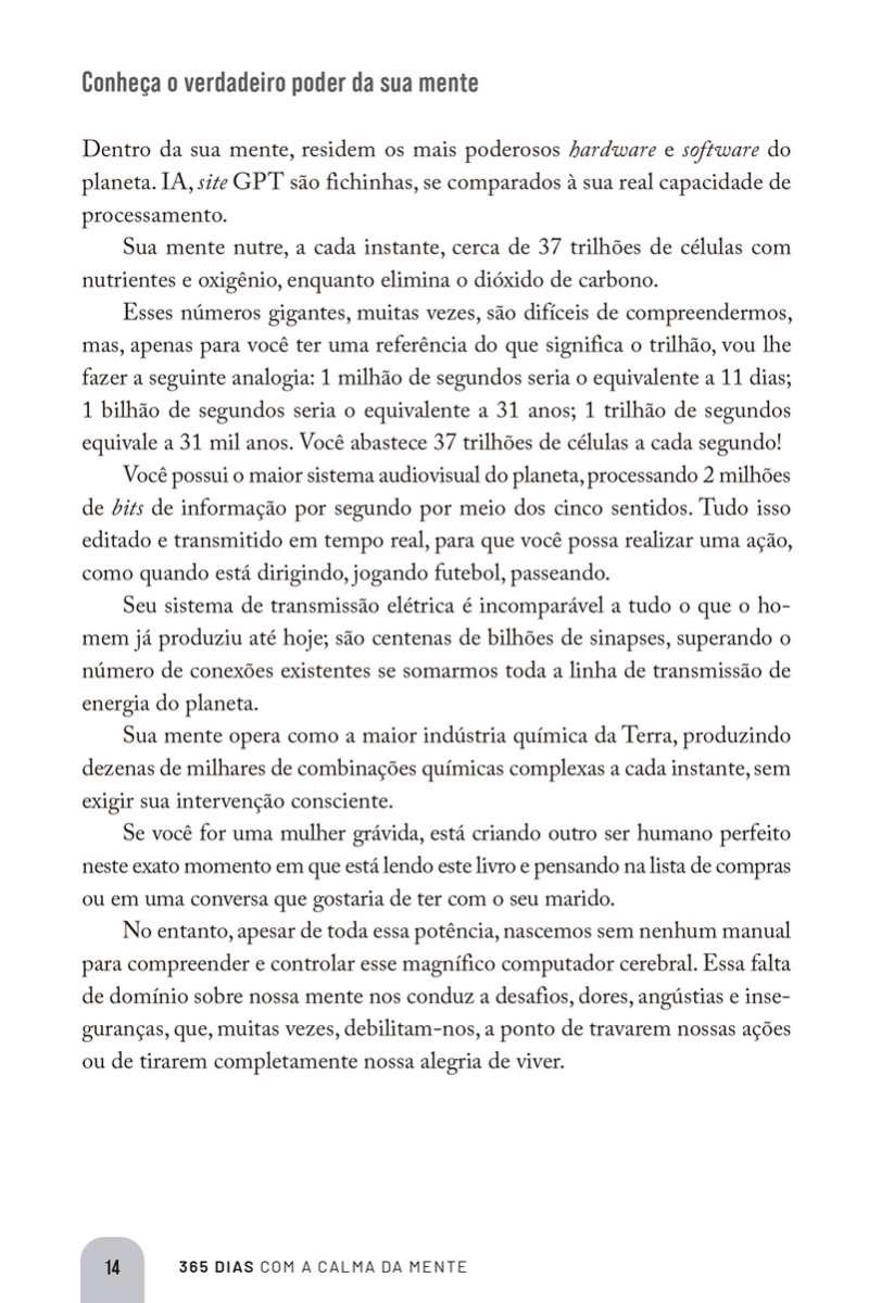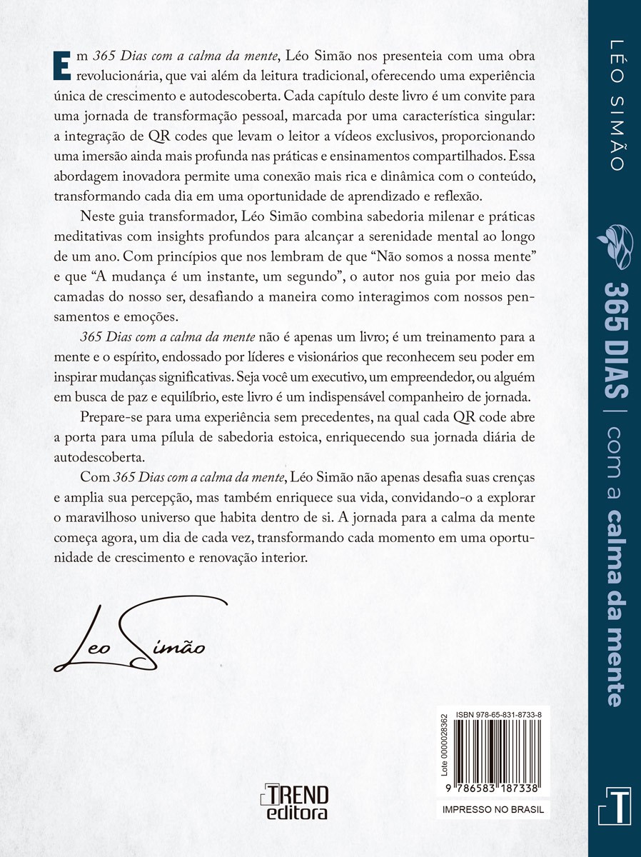 365 Dias com a Calma da Mente é um manual diário de autodesenvolvimento que guia o leitor por uma jornada de um ano para cultivar a paz interior, a resiliência e o propósito. Escrito por Léo Simão, o livro é uma compilação dos melhores episódios de seu podcast Meditação Estoica, que alcançou o status de um dos 1 mais compartilhados no mundo pelo Spotify. A obra combina a sabedoria de filosofias milenares como o estoicismo, com conceitos modernos de PNL (Programação Neurolinguística) e neurociência. O autor utiliza a sua própria experiência de vida, incluindo a superação de uma depressão e a reflexão sobre a impermanência da vida, para demonstrar a eficácia desses ensinamentos.