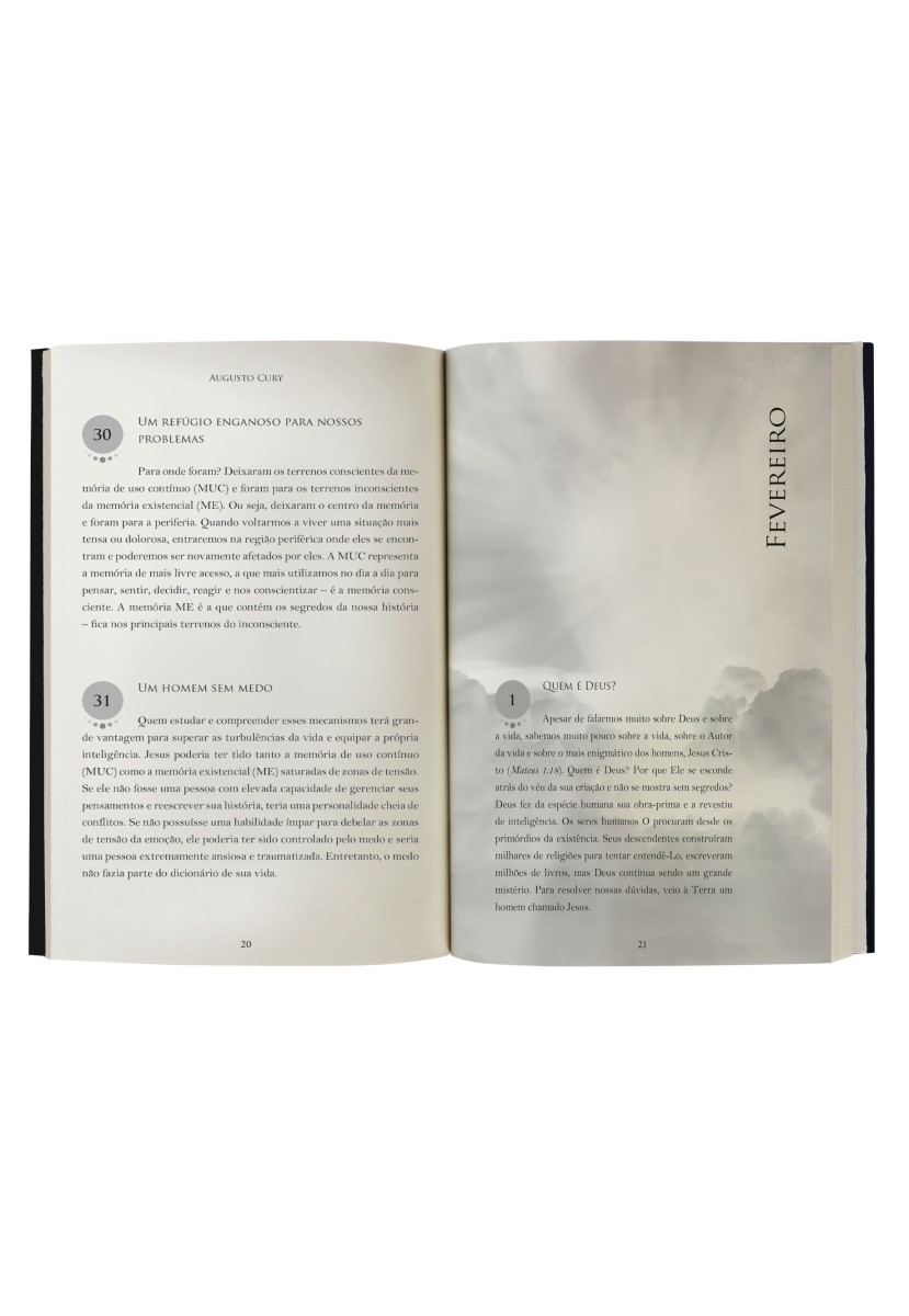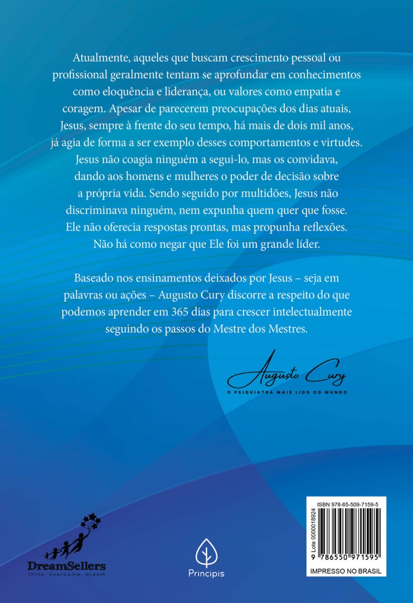 Atualmente, aqueles que buscam crescimento pessoal ou profissional geralmente tentam se aprofundar em conhecimentos como eloquência e liderança, ou valores como empatia e coragem. Apesar de parecerem preocupações dos dias atuais, Jesus, sempre à frente do seu tempo, há mais de dois mil anos, já agia de forma a ser exemplo desses comportamentos e virtudes. Jesus não coagia ninguém a segui-lo, mas os convidava, dando aos homens e mulheres o poder de decisão sobre a própria vida. Sendo seguido por multidões, Jesus não discriminava ninguém, nem expunha quem quer que fosse. Ele não oferecia respostas prontas, mas propunha reflexões. Não há como negar que Ele foi um grande líder. Baseado nos ensinamentos deixados por Jesus – seja em palavras ou ações – Augusto Cury discorre a respeito do que podemos aprender em 365 dias para crescer intelectualmente seguindo os passos do Mestre dos Mestres.