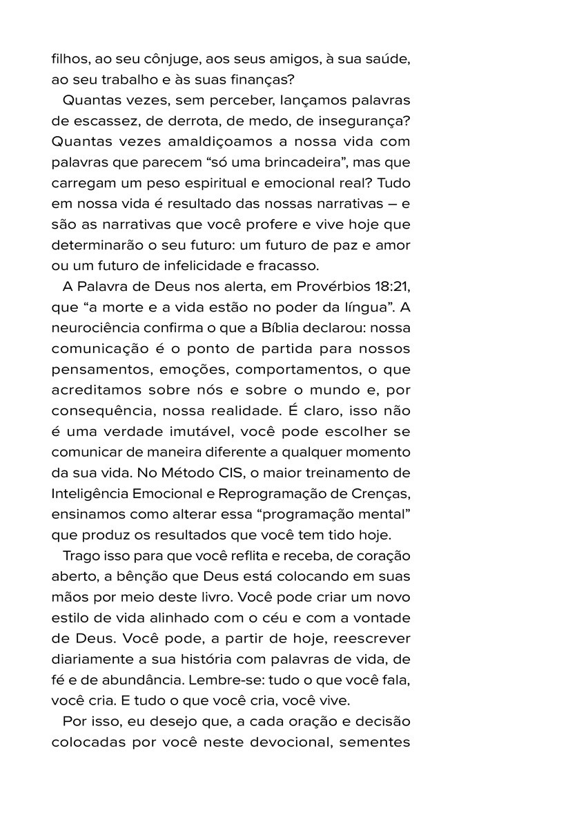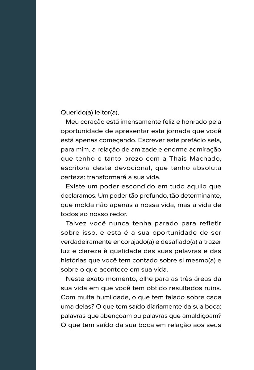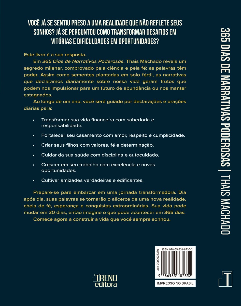 Sinopse365 Dias de Narrativas Poderosas é um guia de autoajuda e inspiração que convida o leitor a uma jornada de 365 dias para transformar a própria realidade através do poder das palavras e da fé. A autora, Thais Machado, baseia-se na ideia de que as palavras que falamos e pensamos funcionam como sementes que moldam nossa vida pessoal, relacionamentos e circunstâncias.