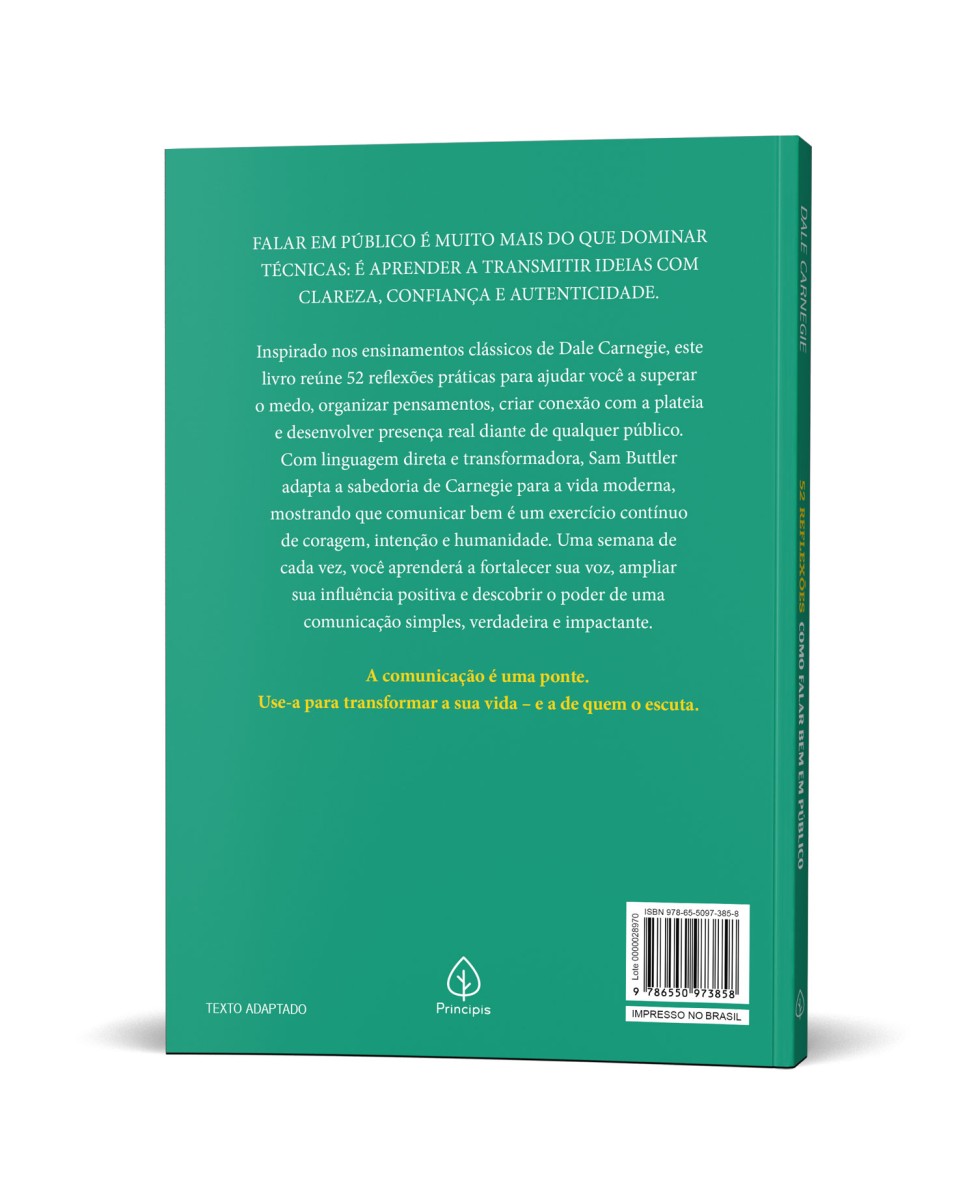 FALAR EM PÚBLICO É MUITO MAIS DO QUE DOMINAR TÉCNICAS: É APRENDER A TRANSMITIR IDEIAS COM CLAREZA, CONFIANÇA E AUTENTICIDADE. Inspirado nos ensinamentos clássicos de Dale Carnegie, este livro reúne 52 reflexões práticas para ajudar você a superar o medo, organizar pensamentos, criar conexão com a plateia e desenvolver presença real diante de qualquer público. Com linguagem direta e transformadora, Sam Buttler adapta a sabedoria de Carnegie para a vida moderna, mostrando que comunicar bem é um exercício contínuo de coragem, intenção e humanidade. Uma semana de cada vez, você aprenderá a fortalecer sua voz, ampliar sua influência positiva e descobrir o poder de uma comunicação simples, verdadeira e impactante.