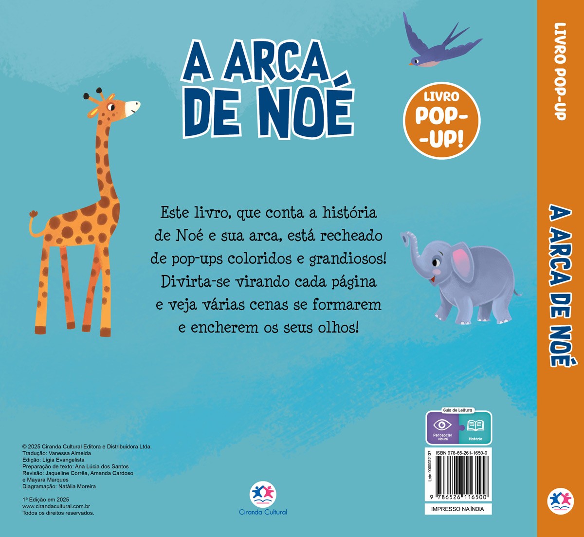 Este livro, que conta a história de Noé e sua arca., está recheado de pop-ups coloridos e grandiosos! Divirta-se virando cada página e veja várias cenas se formarem e encherem os seus olhos!