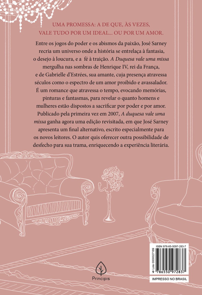 UMA PROMESSA: A DE QUE, ÀS VEZES, VALE TUDO POR UM IDEAL... OU POR UM AMOR. Entre os jogos do poder e os abismos da paixão, José Sarney recria um universo onde a história se entrelaça à fantasia, o desejo à loucura, e a fé à traição. A Duquesa vale uma missa mergulha nas sombras de Henrique IV, rei da França, e de Gabrielle d’Estrées, sua amante, cuja presença atravessa séculos como o espectro de um amor proibido e avassalador. É um romance que atravessa o tempo, evocando memórias, pinturas e fantasmas, para revelar o quanto homens e mulheres estão dispostos a sacrificar por poder e por amor. Publicado pela primeira vez em 2007, A duquesa vale uma missa ganha agora uma edição revisitada, em que José Sarney apresenta um final alternativo, escrito especialmente para os novos leitores. O autor quis oferecer outra possibilidade de desfecho para sua trama, enriquecendo a experiência literária.