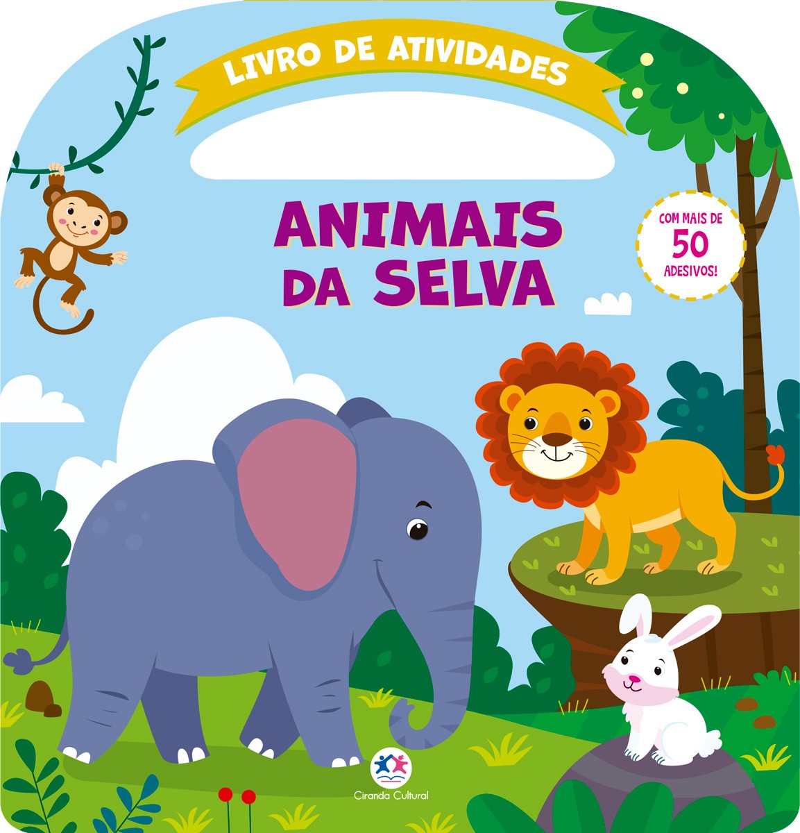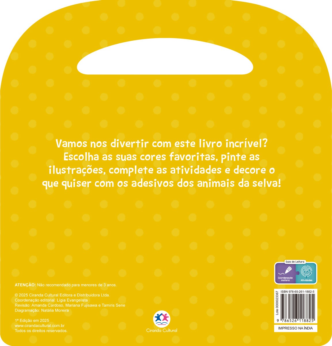 Vamos nos divertir com este livro incrível? Escolha as suas cores favoritas, pinte as ilustrações, complete as atividades e decore o que quiser com os adesivos dos animais da selva!