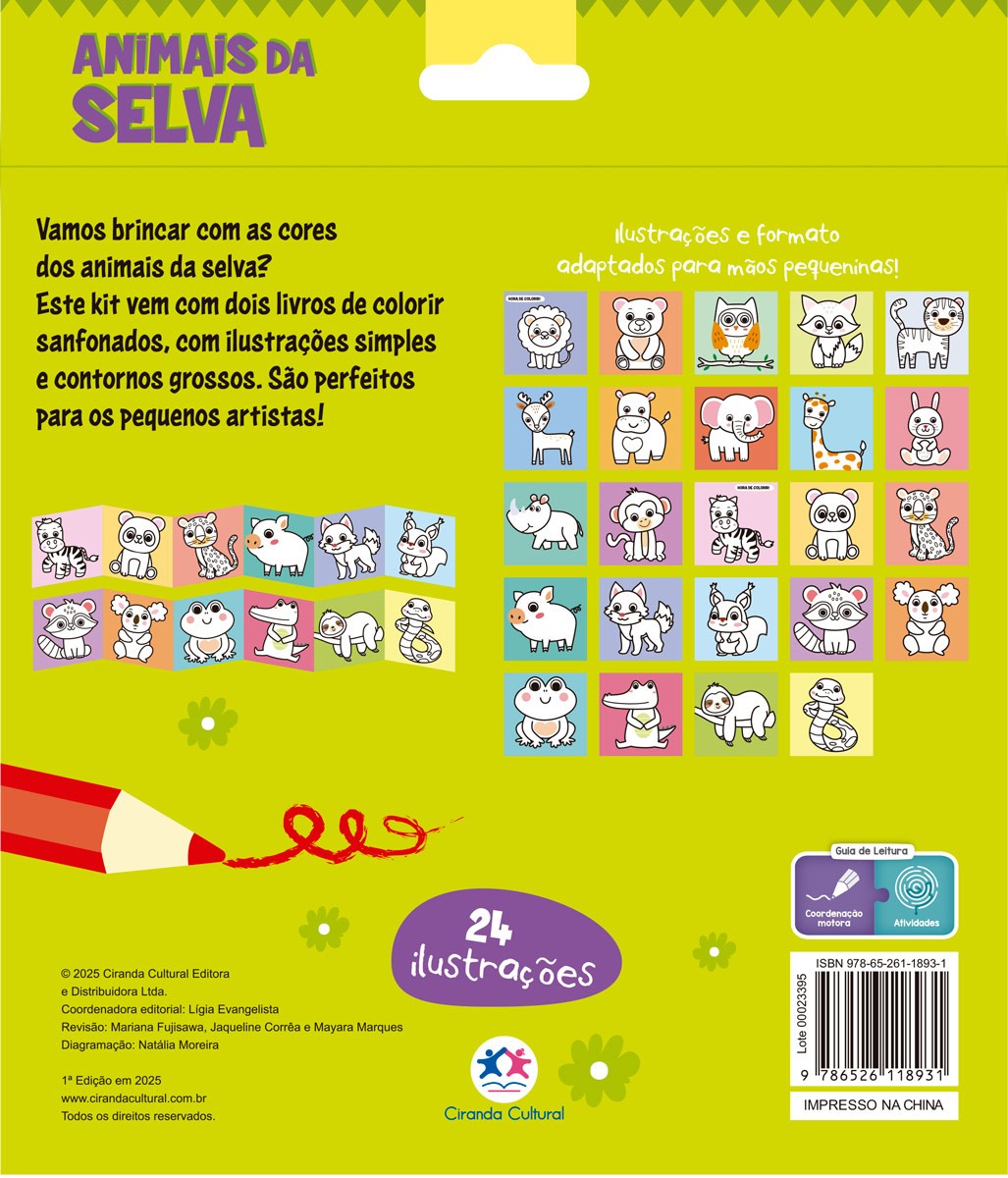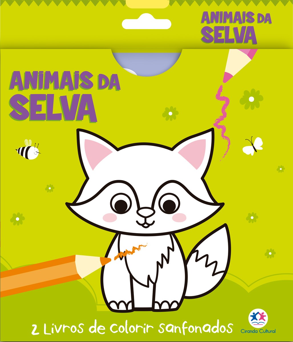 Vamos brincar com as cores dos animais da selva? Este kit vem com dos livros de colorir sanfonados, com ilustrações simples e contornos grossos. São perfeitos para os pequenos artistas!