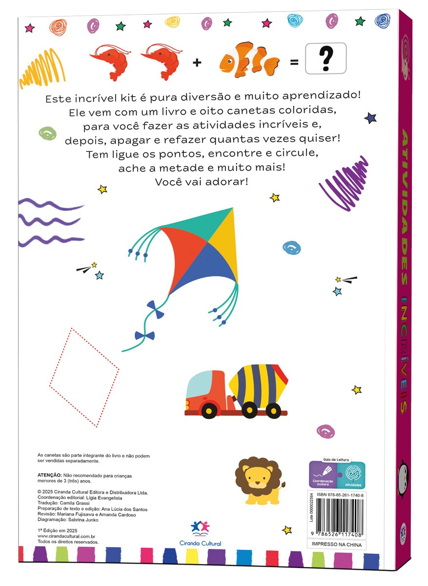 Este incrível kit é pura diversão e muito aprendizado! Ele vem com um livro e oito canetas coloridas, para você fazer as atividades incríveis e, depois, apagar e refazer quantas vezes quiser! Tem ligue os pontos, encontre e circule, ache a metade e muito mais! Vem com: 8 canetas coloridas com miniapagadores acoplados e livro de atividades. Você vai adorar!