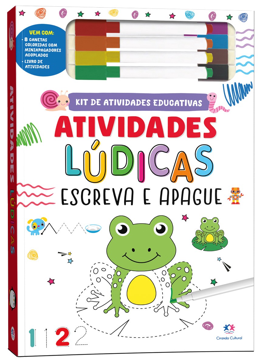 Este incrível kit é pura diversão e muito aprendizado! Ele vem com um livro e oito canetas coloridas, para você fazer as atividades fantásticas e, depois, apagar e refazer quantas vezes quiser! Tem jogo das sombras, labirinto, jogo dos erros, jogo das diferenças e muito mais! Vem com: 8 canetas coloridas com miniapagadores acoplados e livro de atividades. Você vai adorar!