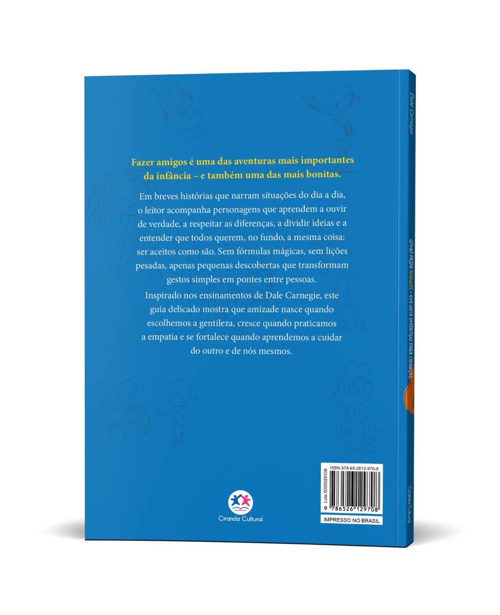 Fazer amigos é uma das aventuras mais importantes da infância – e também uma das mais bonitas. Em breves histórias que narram situações do dia a dia, o leitor acompanha personagens que aprendem a ouvir de verdade, a respeitar as diferenças, a dividir ideias e a entender que todos querem, no fundo, a mesma coisa: ser aceitos como são. Sem fórmulas mágicas, sem lições pesadas, apenas pequenas descobertas que transformam gestos simples em pontes entre pessoas. Inspirado nos ensinamentos de Dale Carnegie, este guia delicado mostra que amizade nasce quando escolhemos a gentileza, cresce quando praticamos a empatia e se fortalece quando aprendemos a cuidar do outro e de nós mesmos.