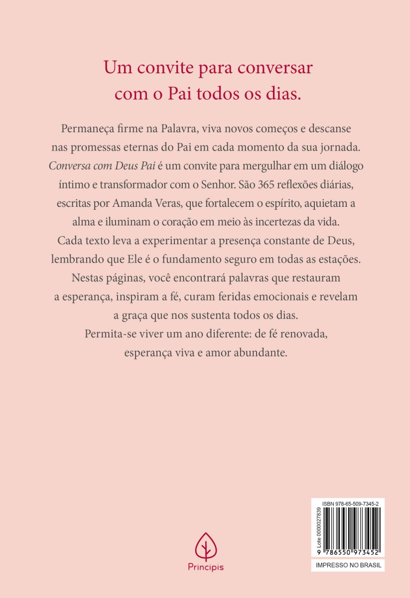 Permaneça firme na Palavra, viva novos começos e descanse nas promessas eternas do Pai em cada momento da sua jornada. Conversa com Deus Pai é um convite para mergulhar em um diálogo íntimo e transformador com o Senhor. São 365 reflexões diárias, escritas por Amanda Veras, que fortalecem o espírito, aquietam a alma e iluminam o coração em meio às incertezas da vida.