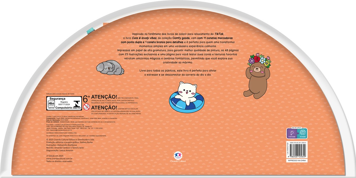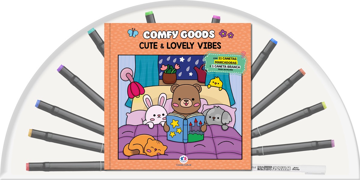 Inspirado no fenômeno dos livros de colorir para relaxamento do TikTok, o livro Cute & lovely vibes, da coleção Comfy goods, vem com 11 canetinhas marcadoras com ponta dupla e 1 marcador de cor branco para detalhes e é perfeito para quem ama transformar momentos simples em uma verdadeira experiência calmante.