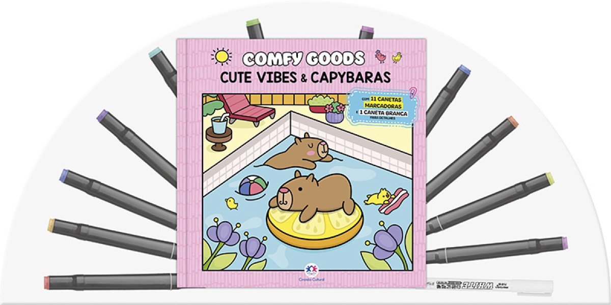Inspirado no fenômeno dos livros de colorir para relaxamento do TikTok, o livro Cute vibes & capybaras, da coleção Comfy goods, vem com 11 canetinhas marcadoras com ponta dupla e 1 marcador de cor branco para detalhes e é perfeito para quem ama transformar momentos simples em uma verdadeira experiência calmante. Impressas em papel de alta gramatura, para garantir melhor qualidade de pintura, as 48 páginas com 23 ilustrações exclusivas e uma página para você testar suas cores e texturas favoritas retratam momentos cotidianos e aconchegantes, permitindo que você explore sua criatividade ao máximo. Livre para todos os públicos, este livro é perfeito para aliviar o estresse e se desconectar da correria do dia a dia.
